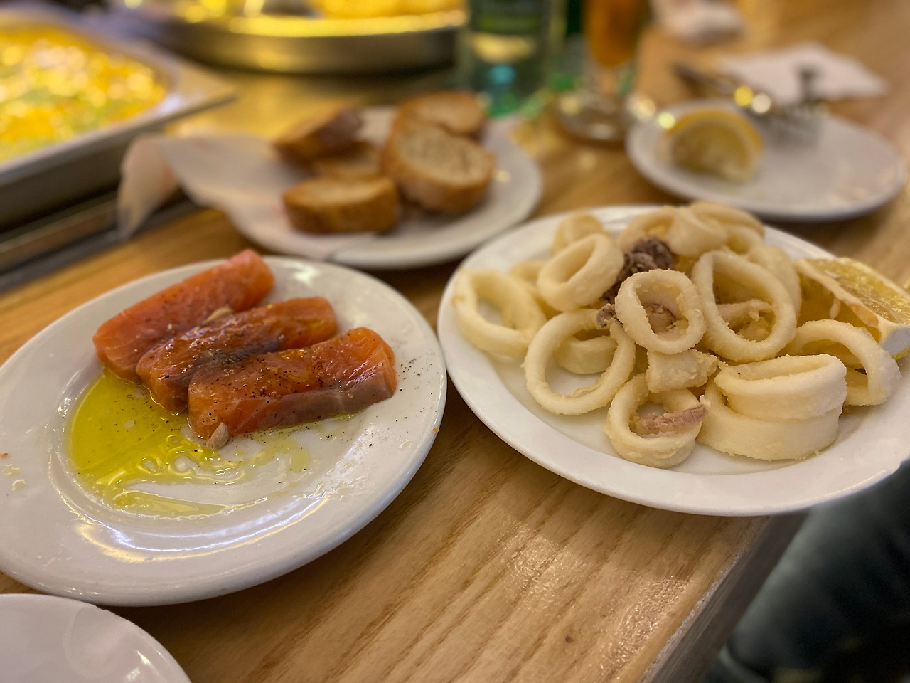 바르셀로나에서 유명한 음식을 찾아보면 푸아그라를 올린 스테이크가 꼭 나오던데, 개인적으로 이날 점심의 MVP는 오징어 튀김이었다. 얇은 튀김옷은 적당히 바삭하면서 쫄깃한 맛이 맥주가 술술 들어가는 맛! 식사용 요리라기보다는 간식에 가까운 음식이라서 여러 가지 종류를 한꺼번에 시켰다. 영국의 살인적인 물가에 비교하면 가격도 매우 합리적인 편! 오래간만에 마음 편히 여러 음식들과 맥주를 마음껏 즐겼다.