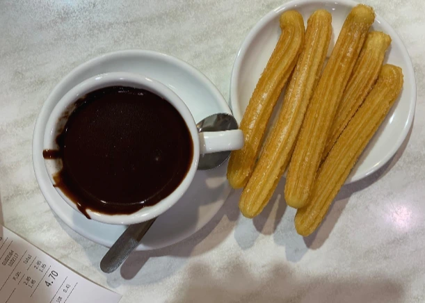 우리가 찾아간 곳은 'Granja la pallaresa'라는 오래되고 유명한 가게인데, 우리나라의 놀이동산에서 맛보는 추로스와는 많이 다른 맛이었다. 초콜릿도 거의 단맛이 없었고 추러스도 설탕이 뿌려져 있긴 하지만 설탕의 양이 많지 않아 단맛이 많이 안 났다. 하지만 향이 좋았달까? 자극적인 맛은 아니었지만 초코랑 바삭한 추러스가 잘 어우러져서 풍부한? 맛이 났다. 추러스 자체의 풍미와 초콜릿의 향의 조합이 꽤 괜찮아서 나는 만족하고 먹었던 간식! 가격도 4.7 유로면 저렴하고 :)