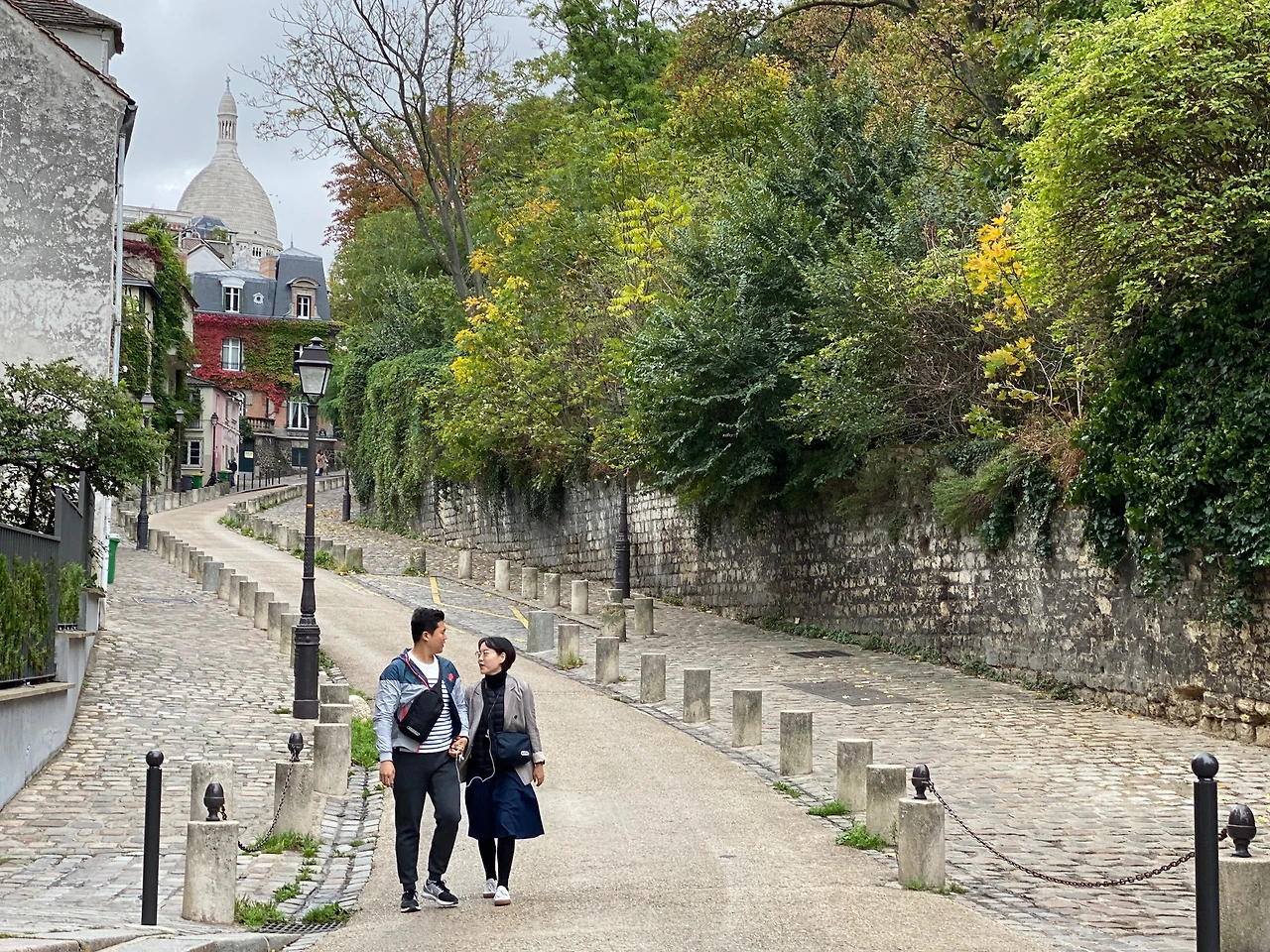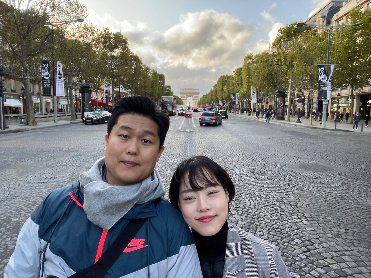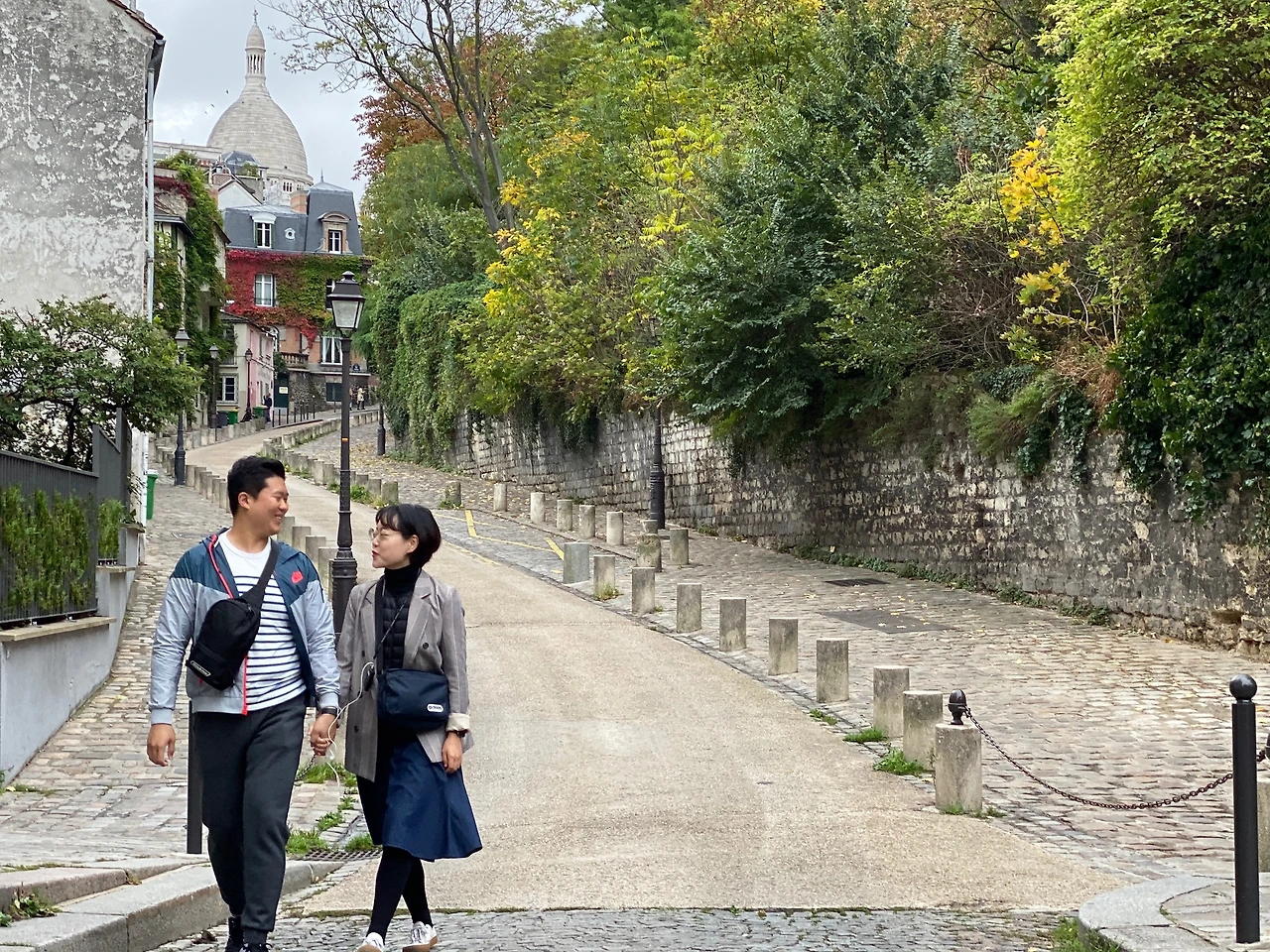 아침 일찍 숙소를 나서서 메트로를 타고 몽마르트 언덕 앞의 작은 공원에서 가이드 분과 다른 일행분들을 만나서 워킹 투어를 시작했다. 우리와 함께한 가이드 분은 정말 혼신의 힘을 다해서 사진을 찍어주시는 가이드 분이었다. 딱 이 각도로 사진을 찍으면 사진이 매우 잘 나온다며 찍어주신 우리의 투샷.