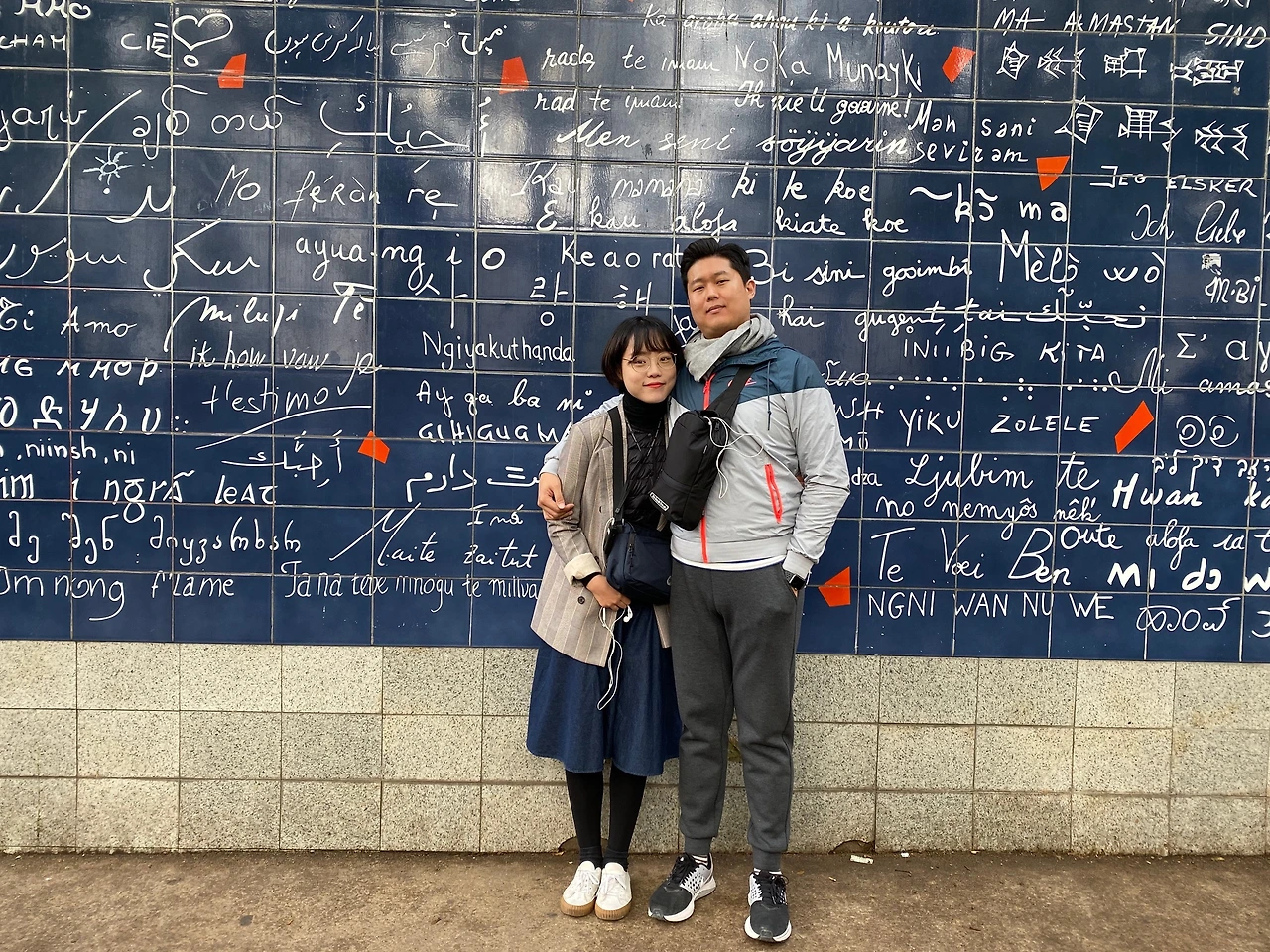 몽마르트 언덕을 올라가는 길에는 유명한 '사랑해 벽' 도 있었는데 ㅋㅋ 당연히 우리는 여기서도 사진을 찍었다. 여행기 내내 썼듯이 방문하는 장소에 대한 사전 지식이 거의 없이 방문했고, 당일 SNS나 온라인을 뒤적이면서 정보를 찾았는데 이 사랑해 벽도 유명한 관광지였다. 프랑스의 젊은 예술가(?)가 만나는 여러 나라의 여행객들에게 해당 국가의 언어로 '사랑해'를 어떻게 쓰는지 노트에 써달라고 한 것을 본떠서 만든 벽이라고 한다.