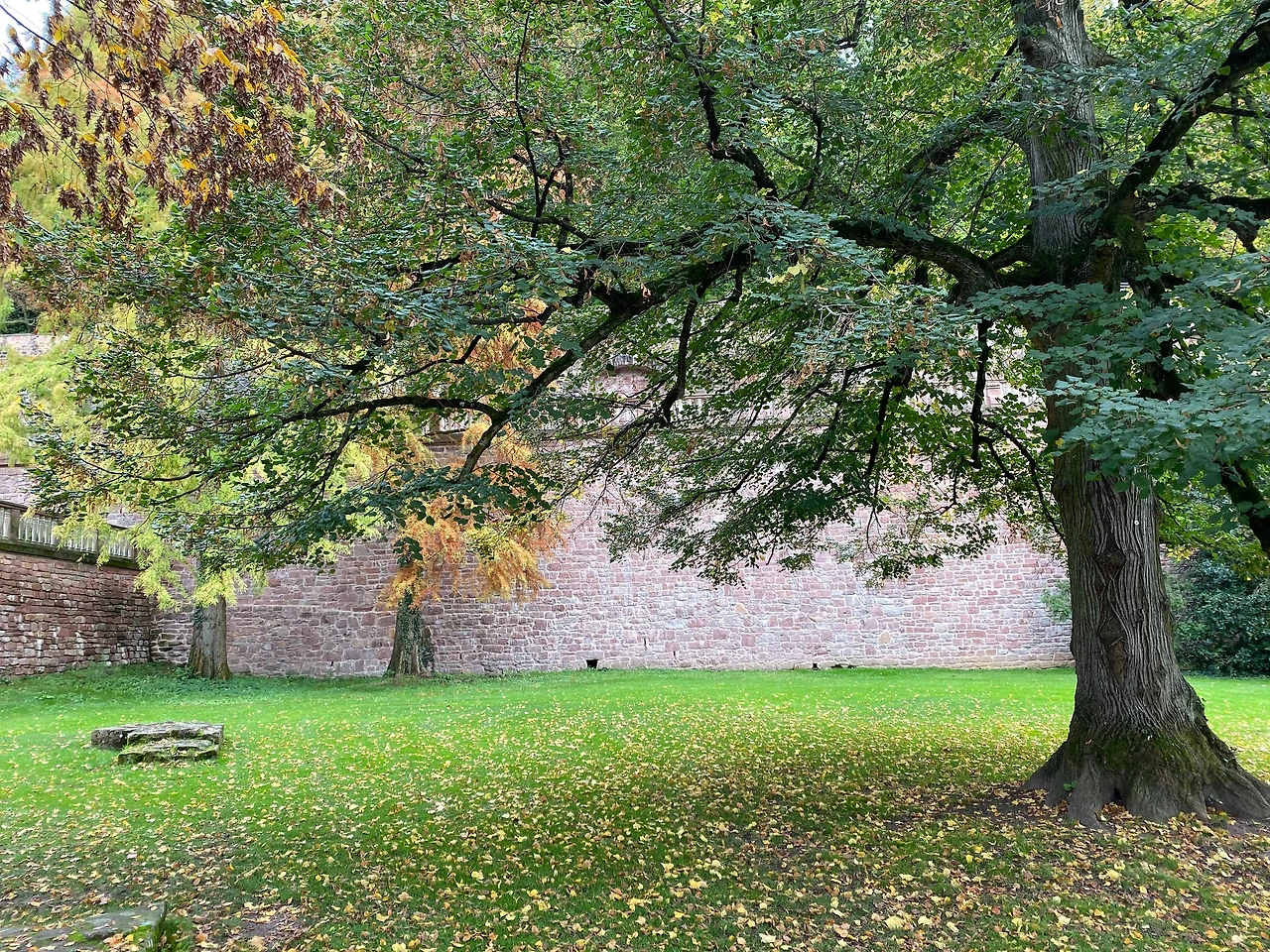 하이델베르크 성에 도착했는데, 우리는 성 내부는 들어가지 않고 주변의 정원과 마당(?)을 산책하면서 구경했다. 유럽여행을 온 이후로 방문했던 여러 도시들은 도시 한복판이거나, 여름 날씨의 휴양지여서 10월이었음에도 불구하고 계절이 가을이라는 걸 실감 못했었다. 그런데 독일에 도착하니 모든 자연들이 완연한 가을이었다. 결혼한 이후로 이런저런 사정으로 남편과 단풍놀이를 한 번도 못 갔었는데 독일에 와서 처음으로 가을이 완연한 단풍을 마음껏 구경했다.
