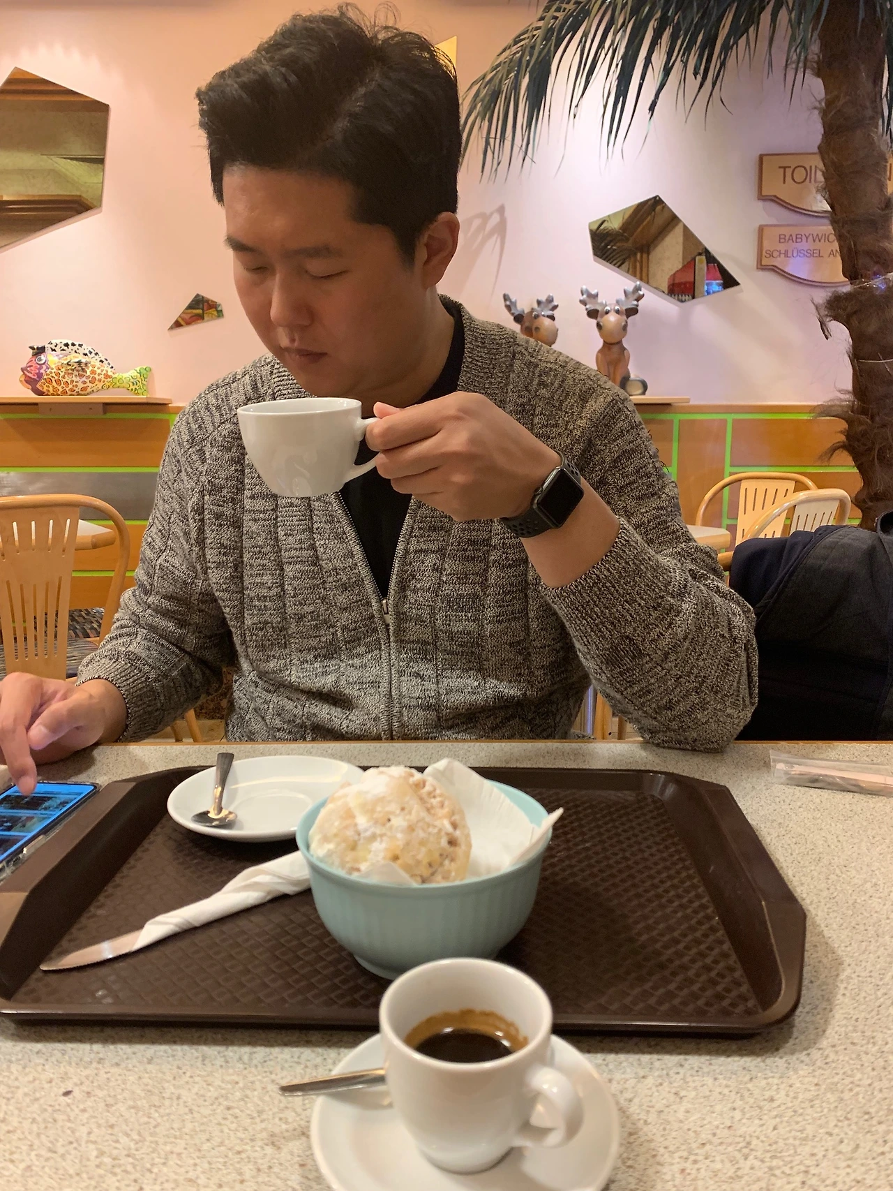 남편과 나는 오리지날 맛이랑 커피를 시켰는데, 로텐부르크의 슈니발렌은 겉에 슈가파우더가 잔뜩 묻어있었음에도 별로 달지 않고 담백한 맛이었다. 우리나라에도 이 슈니발렌을 파는 곳이 많이 있다. 망치로 깨 먹는 게 특이해서 한 때 유명했던 것 같은데 가격에 비해 별 맛이 없어서 나는 별로 좋아하진 않았다. 우리나라에 파는 슈니발렌은 약간 한국화 되어서 그런지 좀 단맛이 강했는데 여기서 먹은 슈니발렌은 그냥 담백하고 심심한 맛이었다. 식감도 맛도 건빵이랑 비슷한 느낌이었다. 로텐부르크에 슈니발렌을 파는 카페는 검색하면 여러 군데가 나오는 듯 하니 궁금하신 분들은 찾아보시고 방문해 보는 것도 여행 온 김에 나쁜 경험은 아닐 듯하다.
