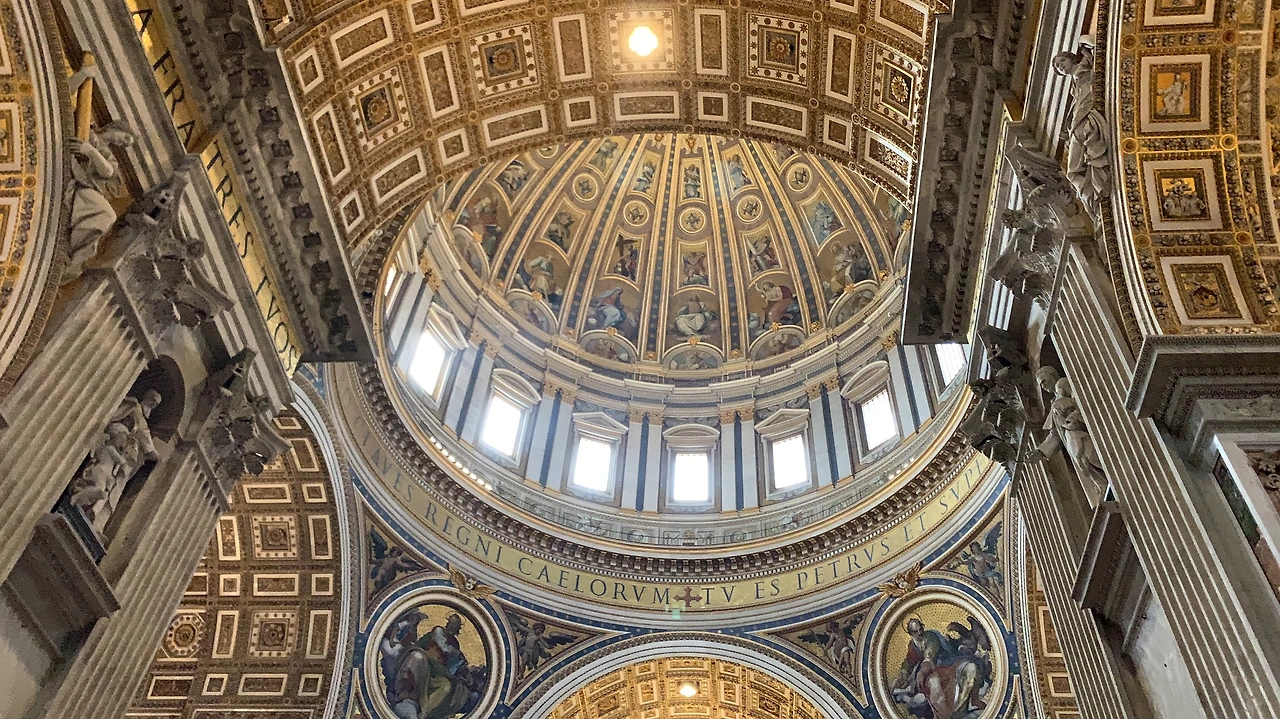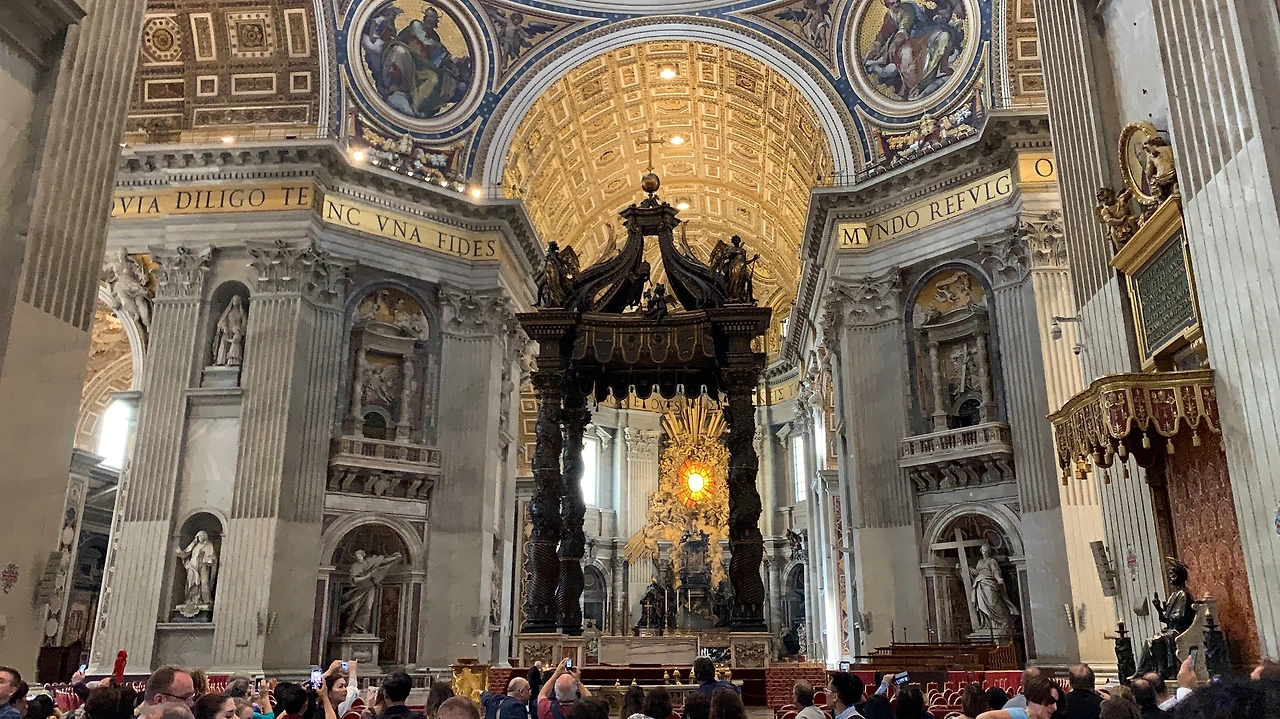 이렇게 교황들이 사용하던 집무실과 여러 공간들을 지나고 나면, 바로 베드로 대성당에 들어갈 수 있다. 들어가자마자 정말 입이 떡 벌어지는 규모와 화려함에 눈을 뗄 수가 없는 수준이다. 이곳이 바로 가톨릭의 수장이 머무는 가장 큰 성당인 베드로 성당. 실제로 성당의 규모가 정말 크고 넓고 높아서 공간감이 잘 안 느껴질 정도이다. 천장에 쓰인 라틴어 알파벳 하나의 높이가 2미터라고 하니, 그 위엄이 어느 정도인지 실감이 나시는지? 입장하자마자 둘러보는데 약간 멀미가 나는 느낌이었다.