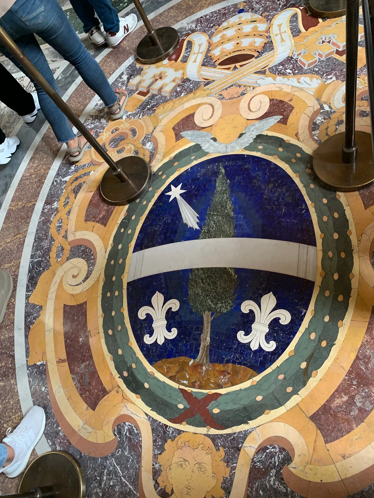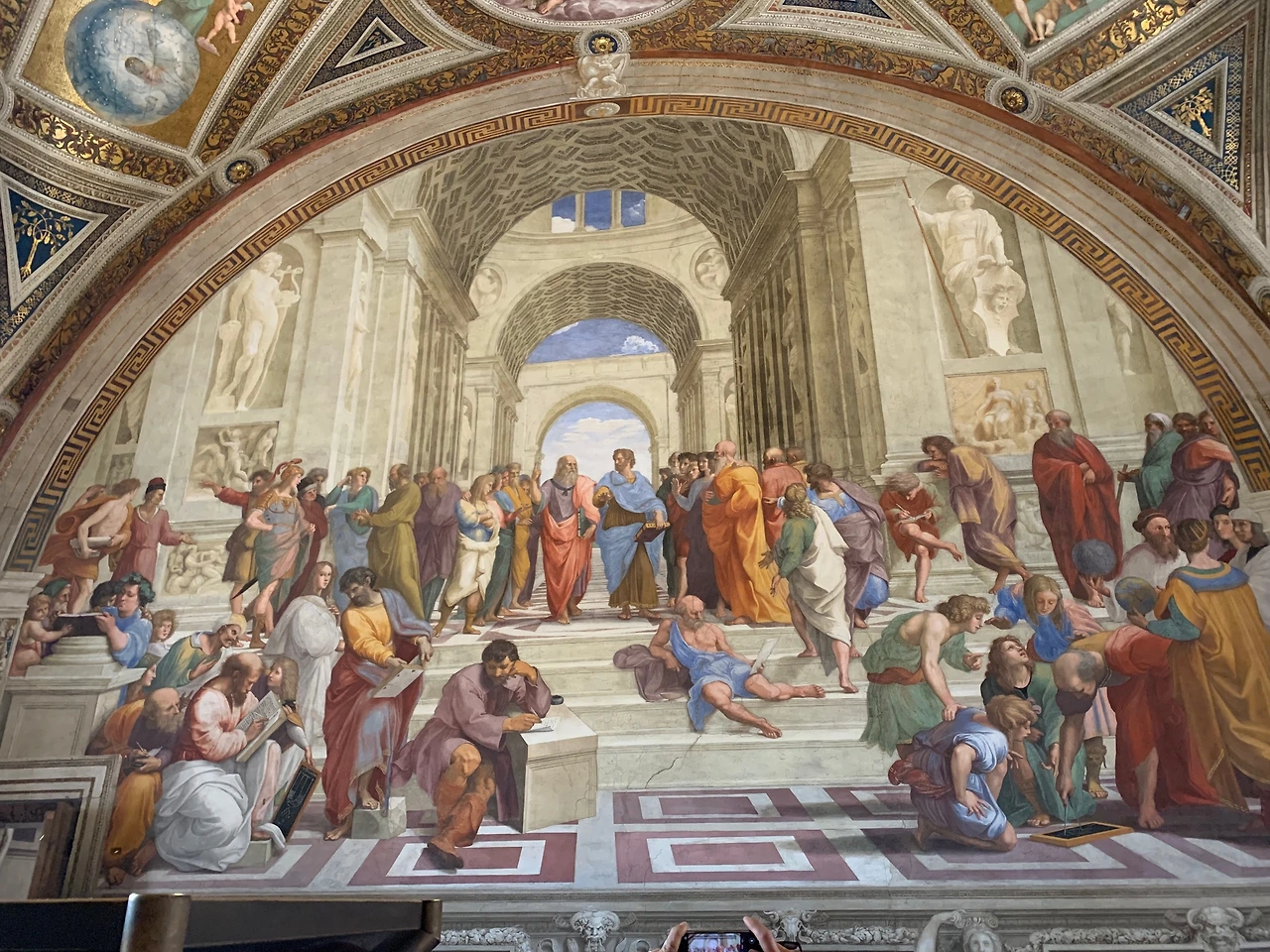 그 당시에 가장 비싼 청색 원석을 조각조각 내서 모자이크화로 바닥을 장식했다. 중세시대에 가장 비싼 염료가 청색 염료였는데, 저 청색 모자이크 타일이 얼마나 비싼 재료였을지.... 그 비싼 자재를 다른 곳이 아닌 '바닥'을 장식할 정도였으니 과연 교황의 위세가 대단했나 보다. 투어를 하다 보면 그 시대 최고의 화가를 데려다가 교황의 집무실이나 사적 공간을 채울 그림을 그리도록 한 방들이 많이 나오는데 그중 최고로 치는 것이 바로 라파엘로의 방. 유명한 아테네 학당 그림도 라파엘로의 방에서 관람할 수 있다. 진짜 모든 벽면을 그림으로 꽉꽉 채워서 꾸며놓았는데 이후에 교황의 사치스러운 생활이 왜 지적받았는지 알 것 같은 수준이다.