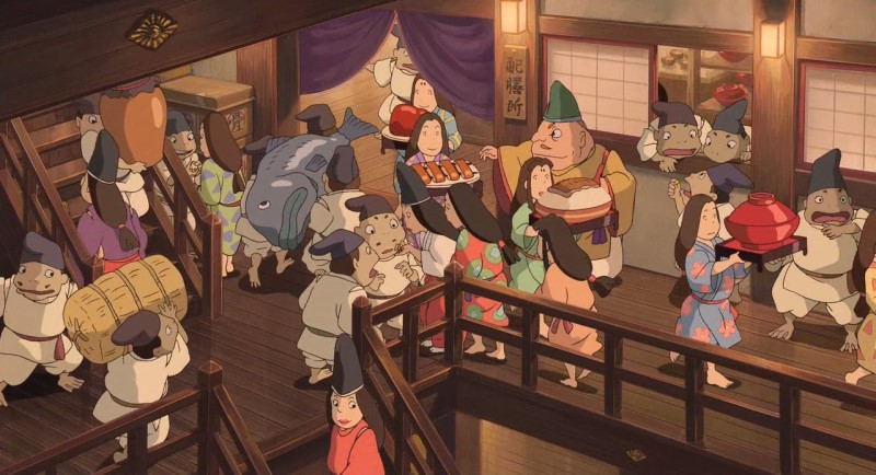영화는 일하지 않으면 동물로 변한다는 설정을 하고 있습니다. 그래서 치히로의 부모님이 주인 허락도 받지 않고 차려진 음식을 먹자 서서히 돼지로 변합니다. 노동을 하지 않고 다른 누군가가 차려 놓은 음식을 먹는 것은 가축과 같다는 것을 희화화해 표현했습니다. 돼지로 변한 부모는 딸이 애타게 부르는 소리도 듣지 못하고 음식에만 넋이 팔립니다. 탐욕에 눈먼 인간은 주변 소리가 들리지 않는 것처럼 말이죠.