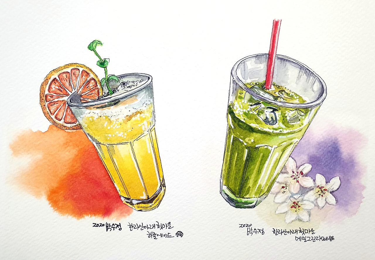 조용한 한 나절을 시간이 멈춘 듯 보내고 메밀밭 펼쳐진 풍경을 바라보며 마시는 메밀그린라떼 한 잔과 한 장의 드로잉~