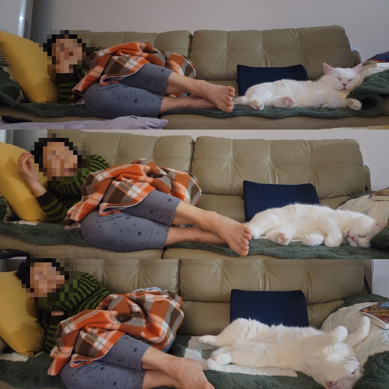 오톨이는 엄마 아빠랑 점점 친해졌다. 옆에서 기웃기웃거리면서 뭐하는지 구경도 하고 추르 한 봉지 안주나 갸웃거리며 졸라 보기도 하고... 그러나 끝까지 안기거나 무릎에 올라가는 행동은 하지 않았고 도톨이는 심지어 아빠가 있는 반경 2m 근처로는 가지 않았다. (아빠만 유난히 무서워하는데.. 아무래도 몸집이 크고 목소리가 낮아서일까) 무섭긴 해도 아무래도 관찰은 해야 했던지 아빠가 잠드시면 잠든 방 문밖에서 스토커처럼 지켜보곤 했다 ;;