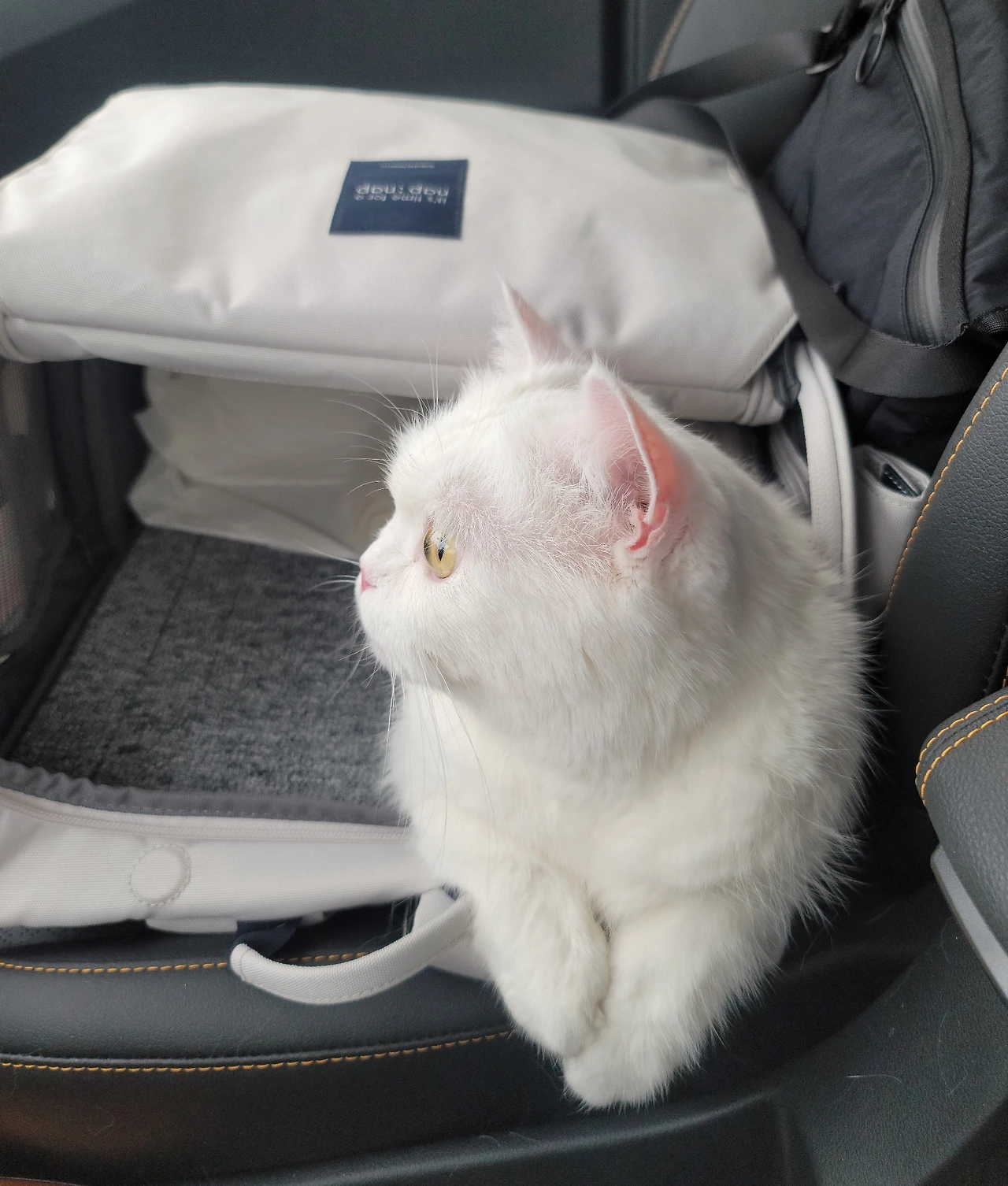 이제 대부분의 드라이빙 시간을 가방 안에 얌전히 품위 있게(?) 앉아있는데 스타벅스 DT에 들르는 날에는 직원들이 고양이가 앉아있다며 구경을 나오기도 한다. (차 안에 고양이가 가방 밖으로 얼굴을 내밀고 앉아있는 경우는 거의 없겠지. 개는 있어도.)