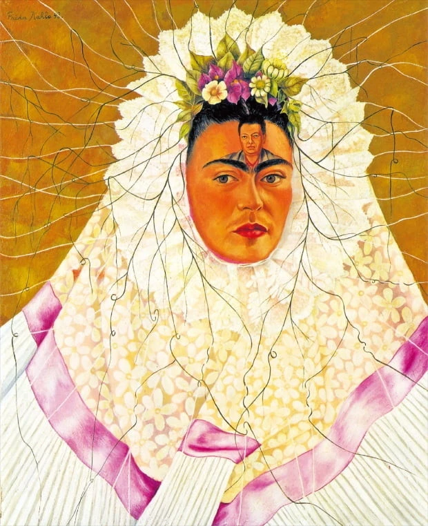 상처에 상처를 거듭하여 마음엔 굳은살이 앉을 법도 한데, 프리다의 그림 속 프리다는 눈은 울고 있지만 아기 같은 디에고를 안고 있기도 하고, 자신의 이마에 디에고의 얼굴을 박제한 듯 그려 넣기도 한다.