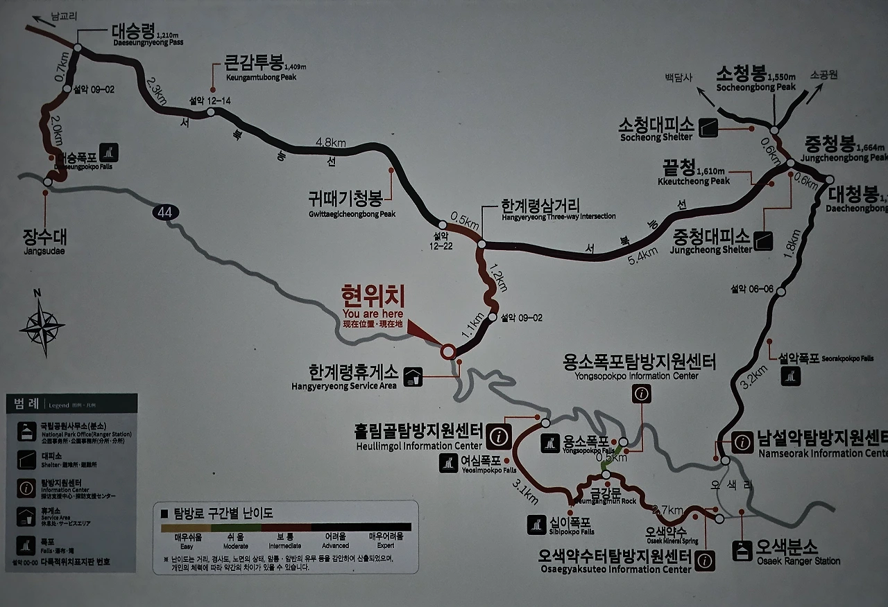 한계령휴게소에서 서북능선,끝청,중청,대청을 지나 남설악탐방지원센터로 내려오는 루트
