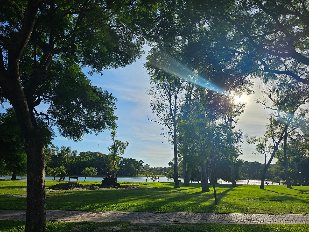 도착해 보니, 햇살에 유리처럼 반짝이는 호수와 아름드리 큰 나무들과 잔디, 벤치 등이 어우러진 아주 아름다운 공원이 나왔다. 와아~~ 햇살이 아주 강할 때만 볼 수 있는 반짝이는 잔잔한 호수.