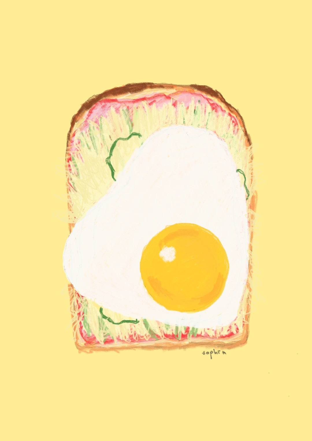 9. 딸기잼을 바른 식빵위에 볶은 야채 계란 치즈 순서대로 올립니다. 케찹을 뿌린 후 다른 씩빵 한 쪽을 덮어 완성합니다.