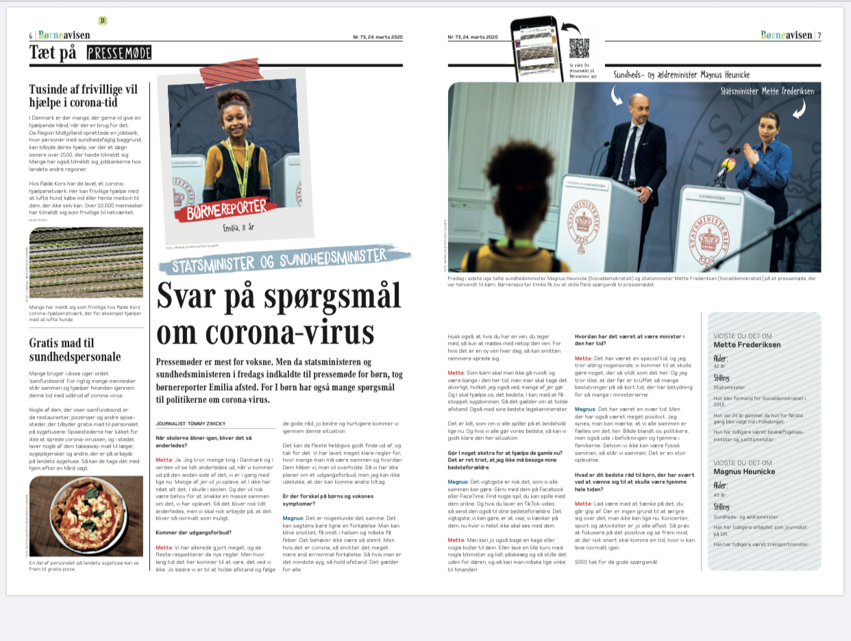 코로나 19 바이러스는 한국뿐 아니라 세계 모든 사람의 일상을 바꾸어 놓았다. 덴마크도 예외는 아니다. 이런 시기에 덴마크에서 일어나는 많은 일 들 중 내가 관찰한 흥미로운 일 하나가 있다. 국가의 리더들은 이 사태에 대해 대응하고 대책을 세우느라 엄청 바쁜 나날들을 보내고 있다. 하지만 그들이 잊지 않는 하나가 있다. 바로 어린이들이다. 덴마크 총리는 메테 프레데릭센 (Mette Frederiksen)은 지난 13일 코로나 19에 대해 børne-pressmøde(어린이기자회견)을 열어 아이들의 이 상황에 대한 기자회견을 열었고 또 한차례 며칠 전 보건부 장관과 함께 기자회견에 참가했다.