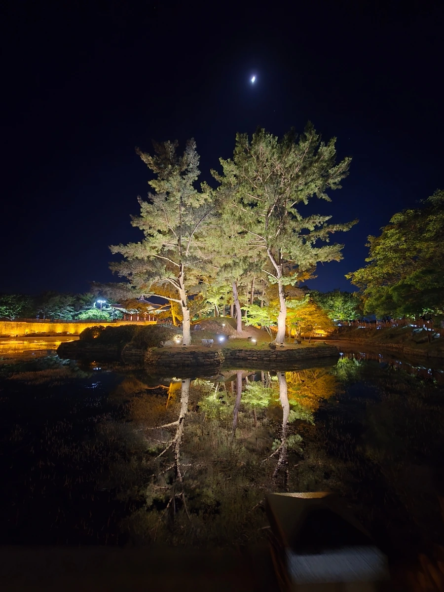 하늘의 달과 연못의 달을 한 컷에 담아 보려고 노력했으나