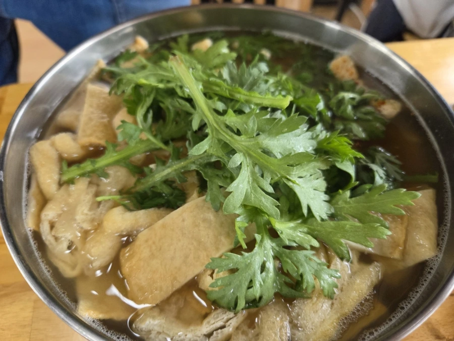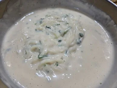 여긴 콩국수에 미나리를 넣어 먹어.
