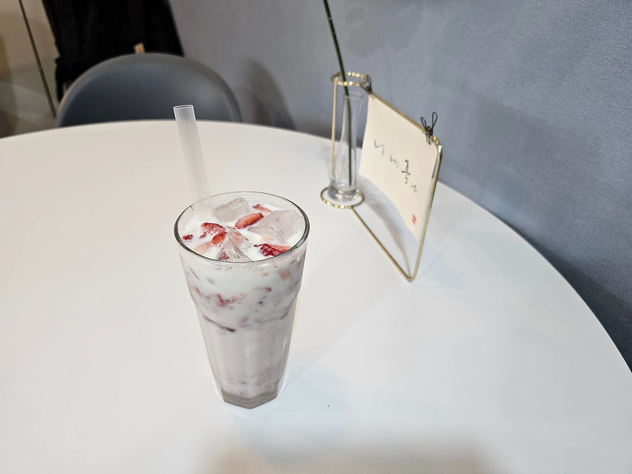 카운터에서 딸기라떼 만드는 법을 전수하는 소리가 들려왔다. 앳되어 보이는 직원이 사장님의 지시에 따라 딸기를 자르고 우유를 부었다. 이내 등장한 새하얀 딸기라떼. 별 기대 없이 한 모금 마셨는데 이럴 수가, 너무나도 맛있다.