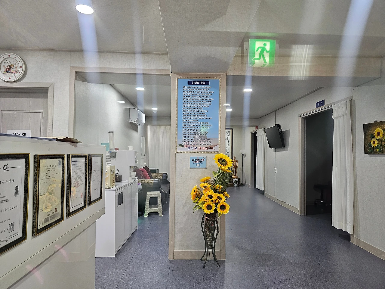 뜻밖에 한의원과 비슷한 실내. 조심스레 문을 열어 보니 리셉셔니스트인 듯한 아주머니가 나오신다. 예약이 있어서 당장은 못 하고 5시에는 가능하단다. 그럼 그때 오겠노라고 예약을 걸어 두고 돌아 나왔다.