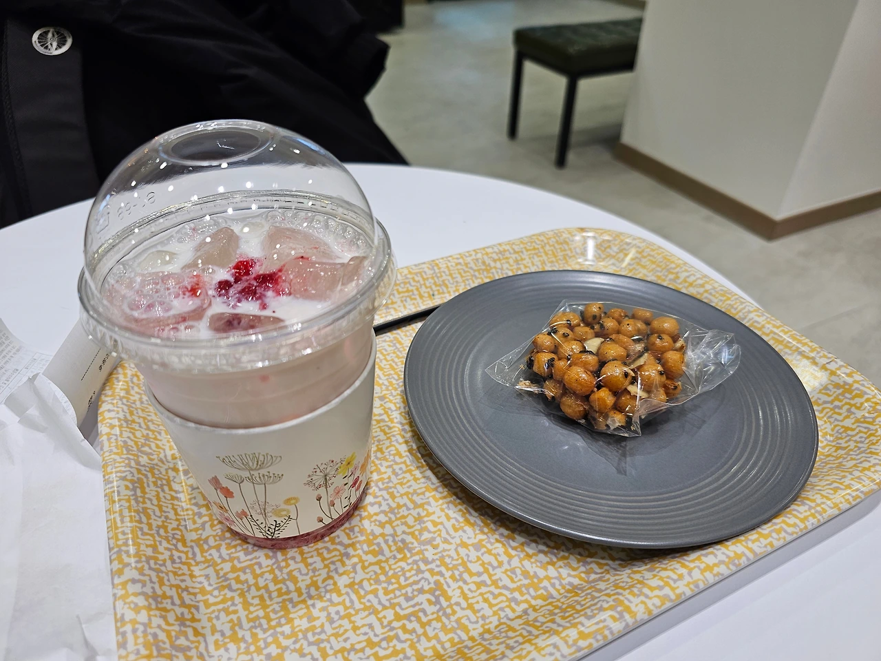 딸기라떼를 먹고 싶어서 다른 카페를 찾아왔다. 커뮤니티센터 비슷한 목적으로 지역사업자들에게 상가 한 칸을 임대해 주는 듯한 건물이었다. 홀 가운데에 테이블과 의자가 놓여 있고 빙 둘러 지역특산물을 파는 가게나 공방들이 영업 중이었다.