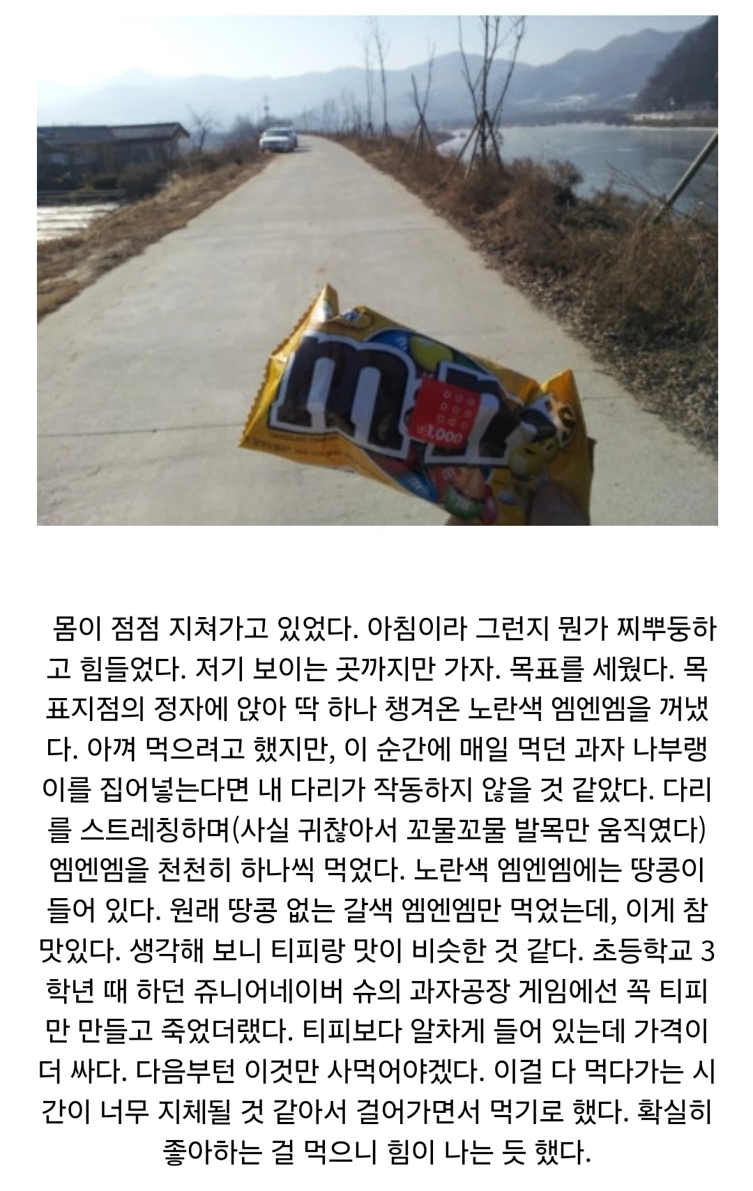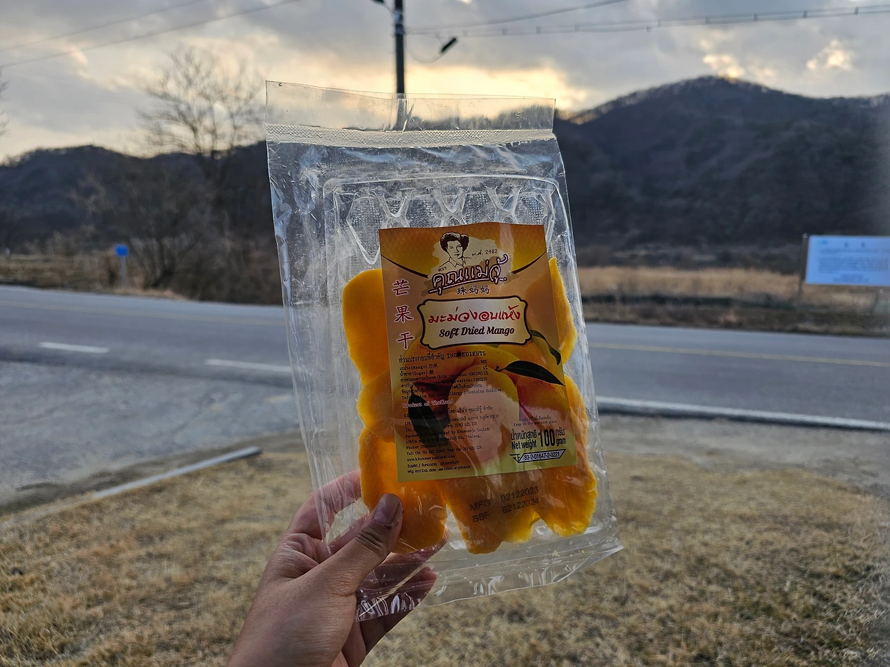 수안보에 나를 보러 와준 D언니가 얼마 전 다녀온 태국여행에서 샀다며 건네준 건망고. 청주 어딘가의 정자 계단에 걸터앉아 지는 해를 바라보며 먹었다. 포장이 애매하게 되어 있어서 가위 없이 못 열까 봐 걱정했는데 다행히 힘으로 찢어발길 수 있었다. 망고젤리들도 맛있었지만 진짜 건망고에 비할 데가 못 되더라. 정말 달고 맛있었다. 못 참고 앉은자리에서 다 먹어 버렸다. 한국땅을 걸어서 여행하는데 외국에서 온 간식을 두 번이나 먹게 되다니, 새삼 내 주변 사람들이 소중하게 느껴지는 순간이었다.