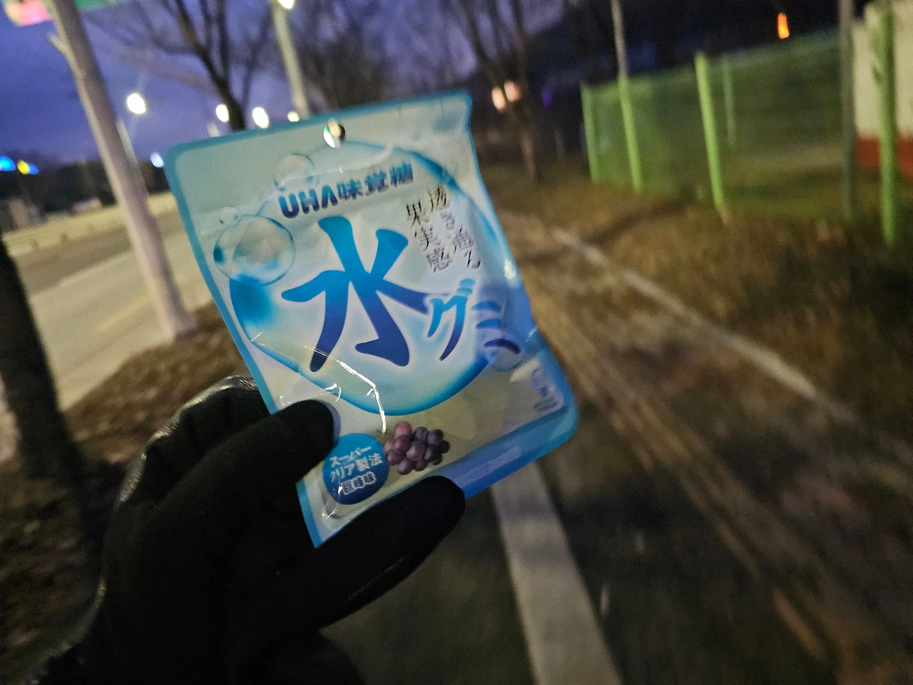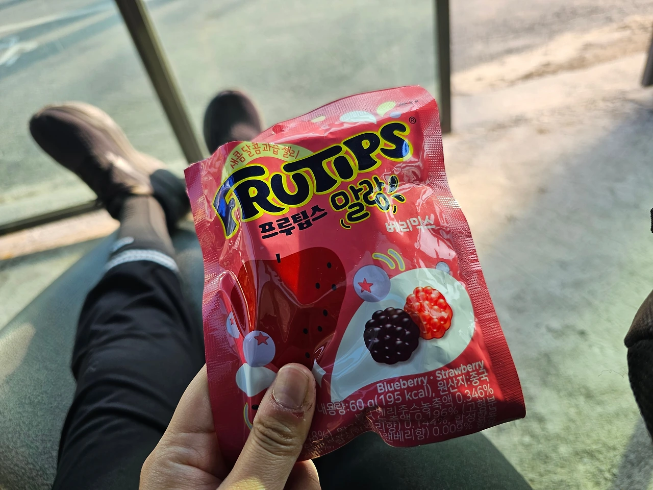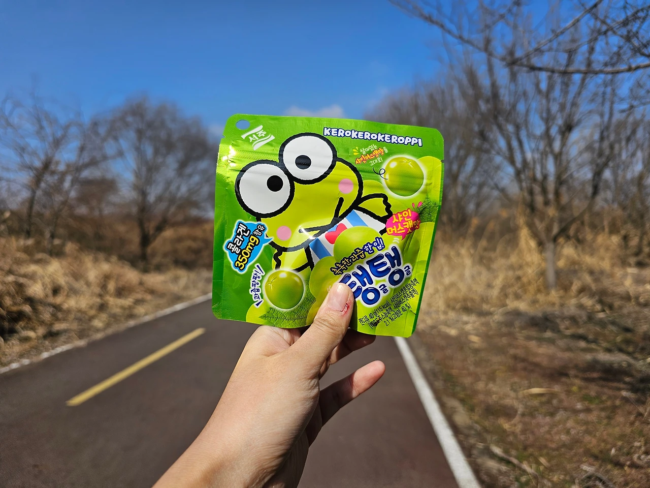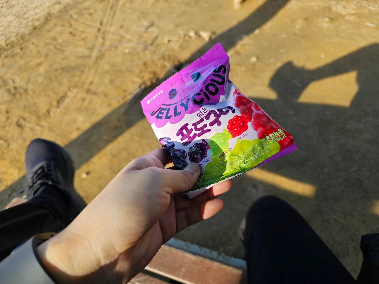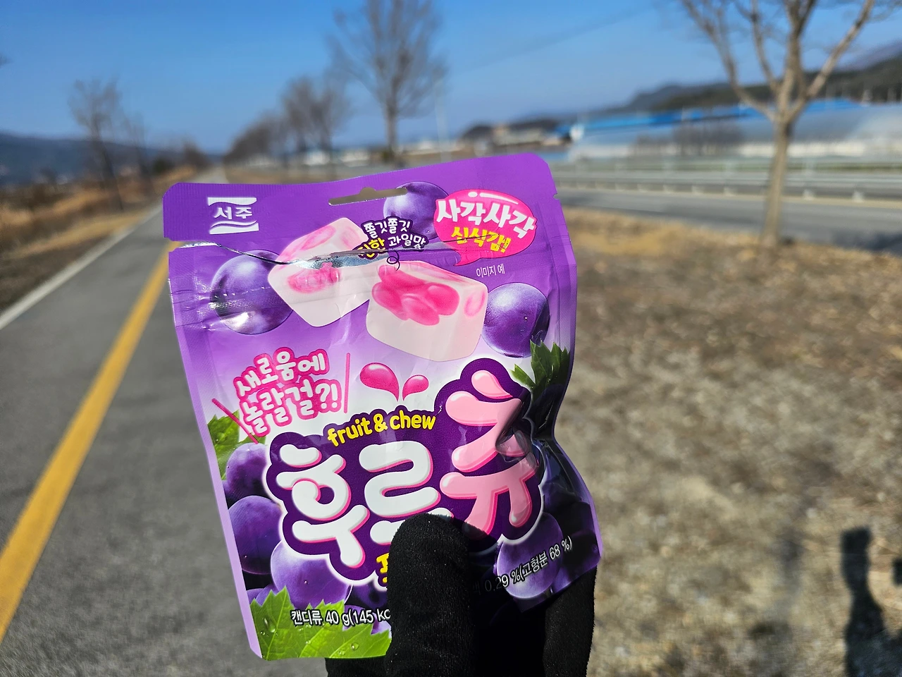 뭐랄까 어렸을 때 껌이 맛있으면 씹어 삼키고 싶다는 생각을 종종 했는데 그 꿈을 현실로 이룰 수 있게 해 준 젤리랄까. 마이쮸보다는 덜 찐득하고 젤리보다는 사각사각한 그런 중간의 식감. 굳이 한 번 더 사 먹고 싶다는 마음이 들지는 않았다. 구미에서 의성 가는 길에 먹었다.
