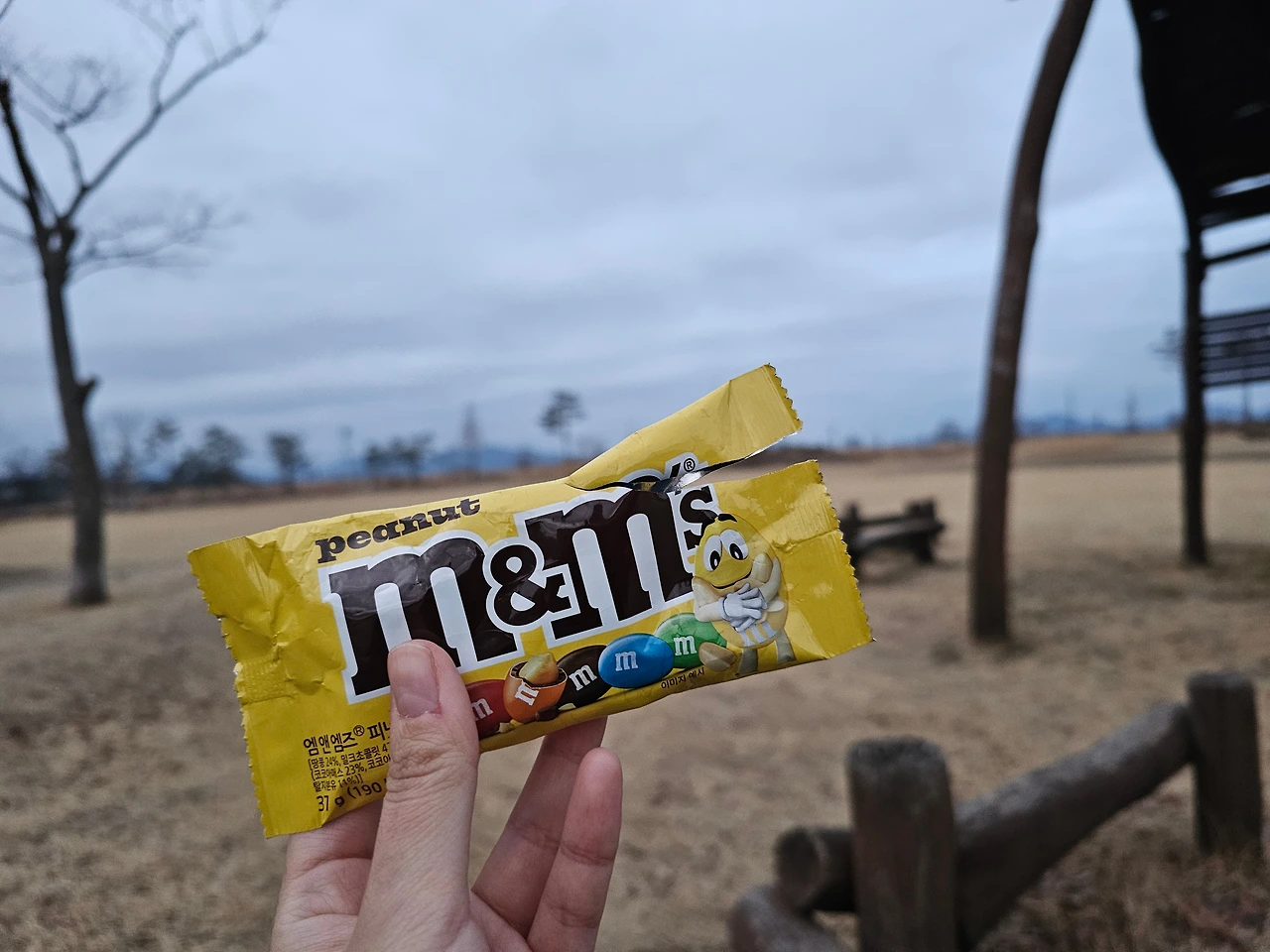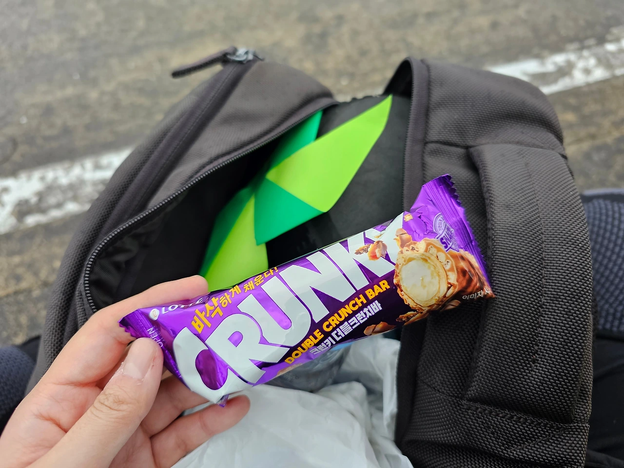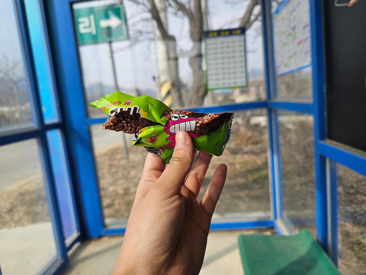초등학생 때였다면 좋아했을 것 같은데... 그냥 정말 알갱이에 초코가 끝이라 맛도 식감도 너무 심심했다. 상주의 어느 버스정류장에서 지친 몸을 쉬어주는 와중에 에너지 부스트를 위해 먹어주었다.