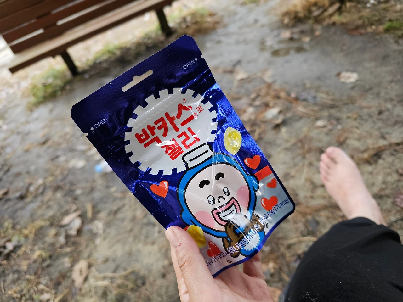 마지막으로 먹은 편의점 간식은 비가 억수로 쏟아지는 날 경기도에 진입하자마자 비가 줄줄 새는 정자에 앉아 먹었던 박카스맛 젤리. 피로회복이 좀 될까 해서 사 봤는데 효과는 잘 모르겠다. 박카스 맛이었다... 이후로는 주로 도심을 걷게 되어서 편의점 간식 대신 호떡, 붕어빵처럼 맨투맨으로 사 먹을 수 있는 간식을 주로 사 먹었다.