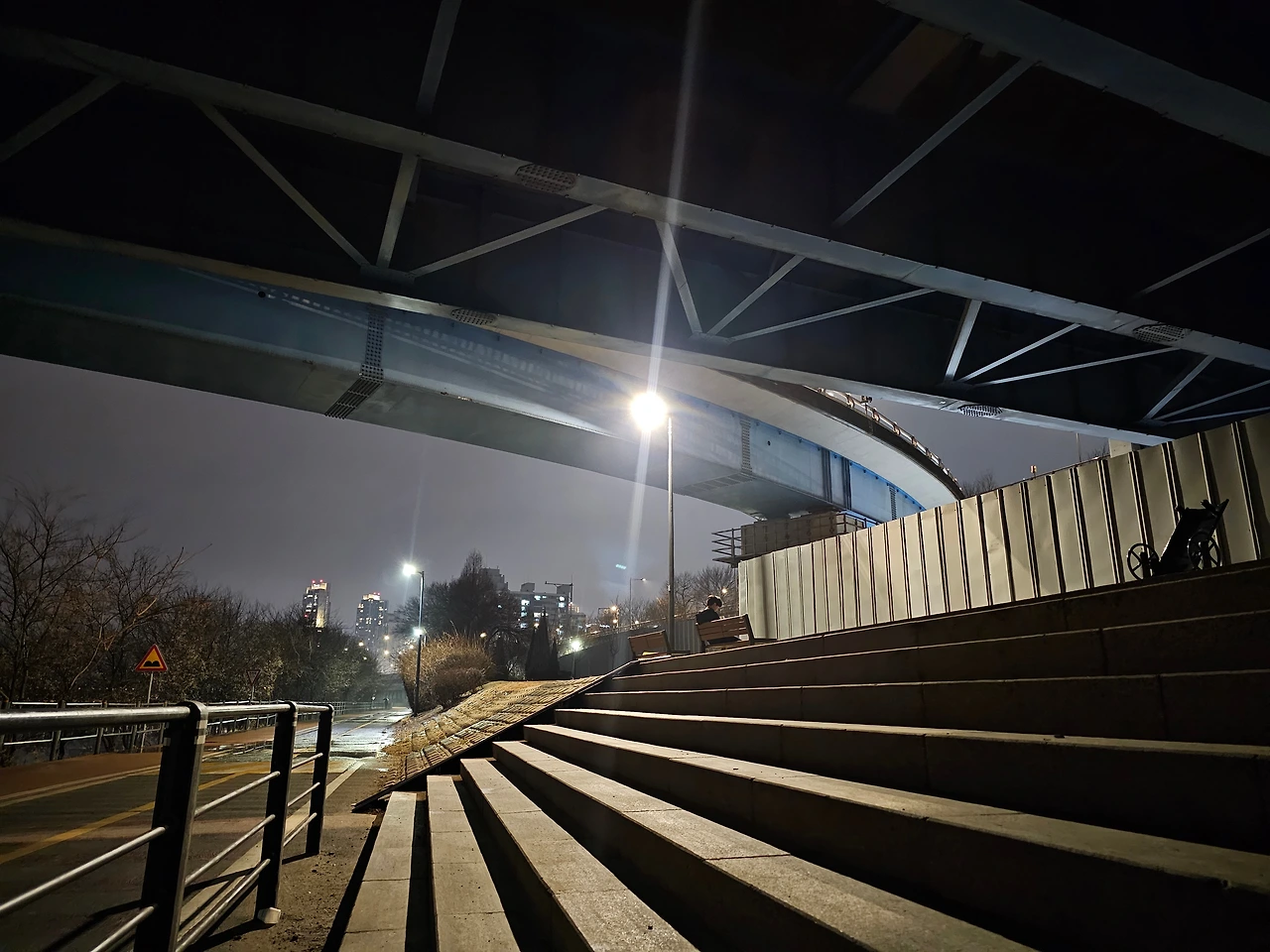 위 사진은 남양주 넘어가기 전에 찍었던 것으로 기억하는데, 어느 다리인지 찾을 수가 없어서 눈앞에 있는 다리에서 재현 사진을 찍었다. 텁텁하기 그지없는 콘크리트 다리와 화려한 조명으로 빛나는 영동대교의 대비. 원래 코스대로라면 영동대교를 건너 강남으로 가야 하는데, 공사 때문에 다리를 건널 수가 없었다. 내친김에 강북으로 쭉 걸어보기로 했다.