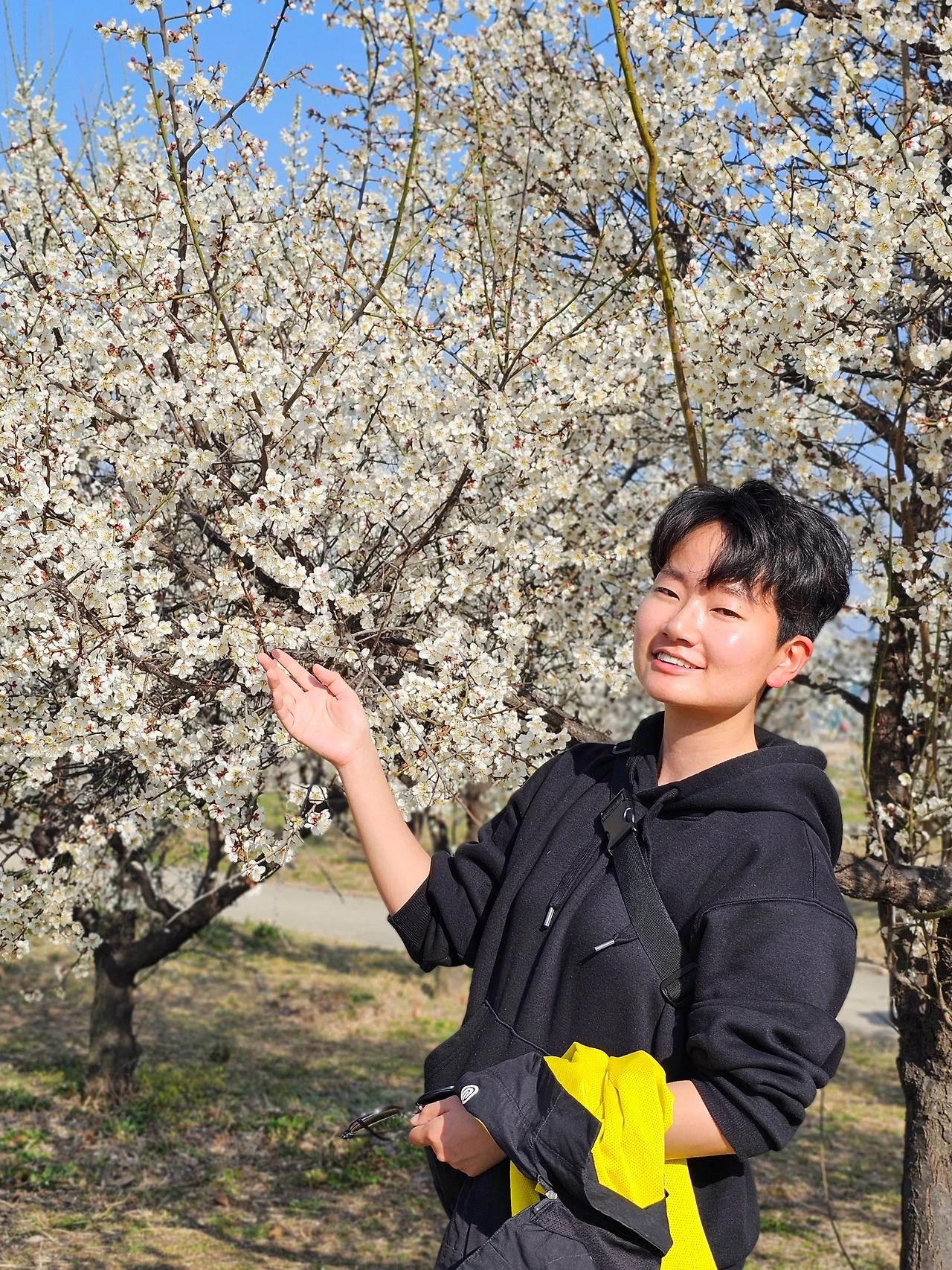 와중에 내 눈에 띈 할아버지 한 분. 테니스채 손잡이가 삐죽 튀어나온 배낭을 메고 손을 있는 힘껏 뻗어 꽃나무와 셀카를 찍고 계셨다. 냉큼 달려가 사진 찍어드릴까요? 하고 물으니 고맙다며 핸드폰을 넘겨주신다. 혼신의 힘을 다해 찍어드리고 사진을 부탁드렸다.