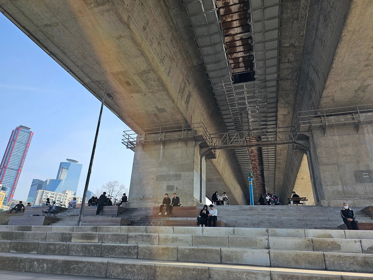 한강을 바라보며 잠시 앉아서 쉬어 주었다. 한강공원은 꽃놀이 온 사람들로 북적이고 있었다. 사진을 안 찍고 넘어가기엔 아쉬울 정도로 온 세상이 꽃 천지였다. 사진을 부탁할 사람이 있나 주변을 한참 둘러보았는데 대부분이 데이트 온 커플이나 아기 데려온 가족이었다.