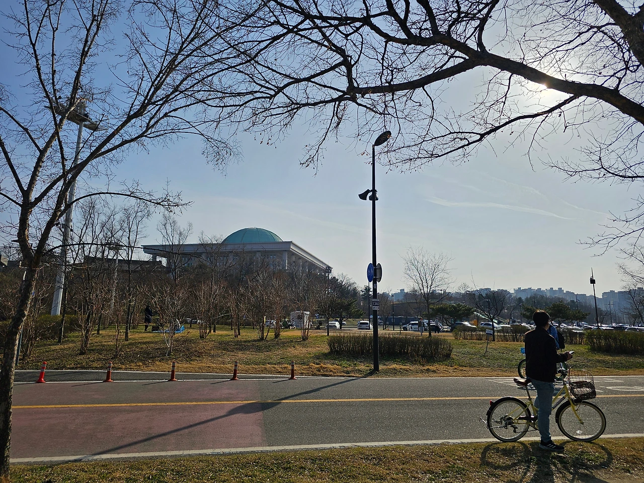 여의도 국회의사당을 지나쳐 간다. 어렸을 때 택시를 타고 가다가 이 하늘색 돔 천장을 보고 엄마에게 저게 뭐냐고 물으니 '니잘났다 나잘났다 하는 곳이야' 해서 동생과 자지러지게 웃었던 기억이 있다. 저 말을 이해하기에 우리는 너무 어렸고 단어의 조합 자체가 재미있었다. 당시에는 그런 랜덤한 단어들이 웃겼다. '코끼리 밥통' 이라던가.