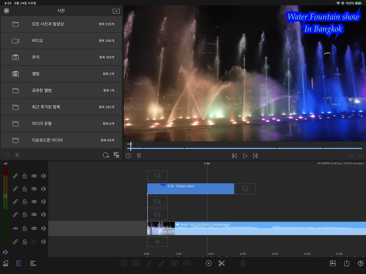 오늘은 방콕 쇼핑몰에서 가족들과 본 ‘분수쇼’ 영상을 편집하고 있습니다.