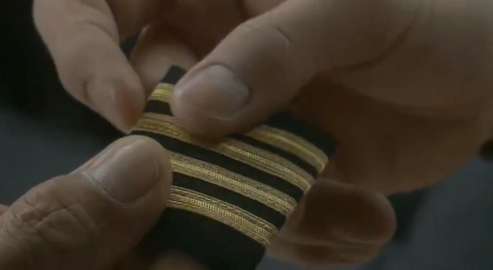 가방을 챙기기 전에, 기장님이 부기장에게 "기장 견장"을 선물합니다.(4줄짜리 기장의 상징)
