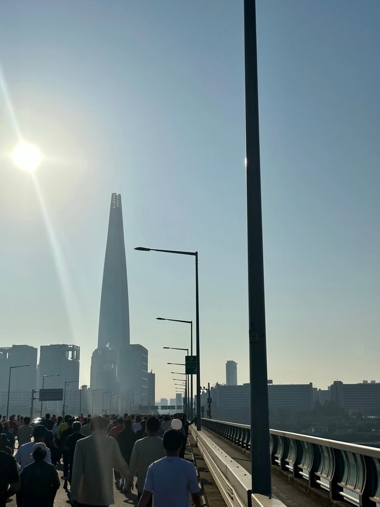 잠실대교 다운힐에 진입할 때가 되니 다시 롯데타워가 만들어주는 그늘이 생겼는데, 덕분에 한결 편하게 달릴 수 있었다. 그러자 어렴풋이 들리는 '파이팅' 소리. 여러 크루의 응원단들의 응원 소리도 있었지만, 오전 볼일을 보러 나오신 듯한 동네 주민 어르신 한 분이 큰 소리로 '파이팅'을 외쳐주시는데 그게 어찌나 큰 힘이 되던지, 괜히 울컥했다.