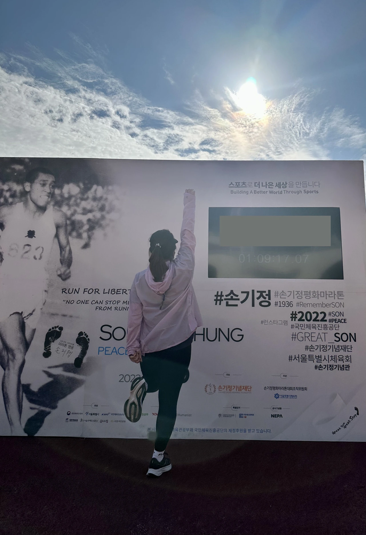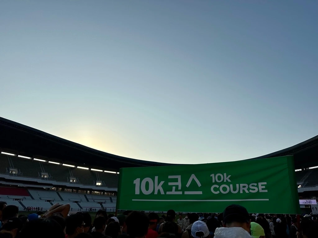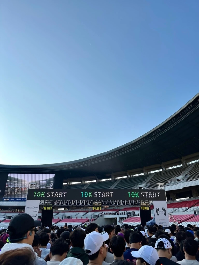 보조경기장을 한 바퀴 돌아 여러 동호회 사람들이 삼삼오오 모여 인사를 나누는 모습을 보니 조금은 부러웠다. 혼자 왔으면 외로웠을 것 같은데, 그래도 신랑과 함께라 마음이 든든했다. 보조경기장에서 간단한 준비운동을 하고 신랑과 서로 배 띠와 기록칩을 달아준 다음 주 경기장으로 향했다. 이번 대회는 거의 1만 명에 달하는 사람들이 참석했다고 하는데, 대회장 내부가 엄청난 인파로 와글와글했다. 그리고 하나같이 사람들의 얼굴엔 엄청난 설렘과 약간의 긴장감이 섞인 기분 좋은 홍조를 띠고 있었다.