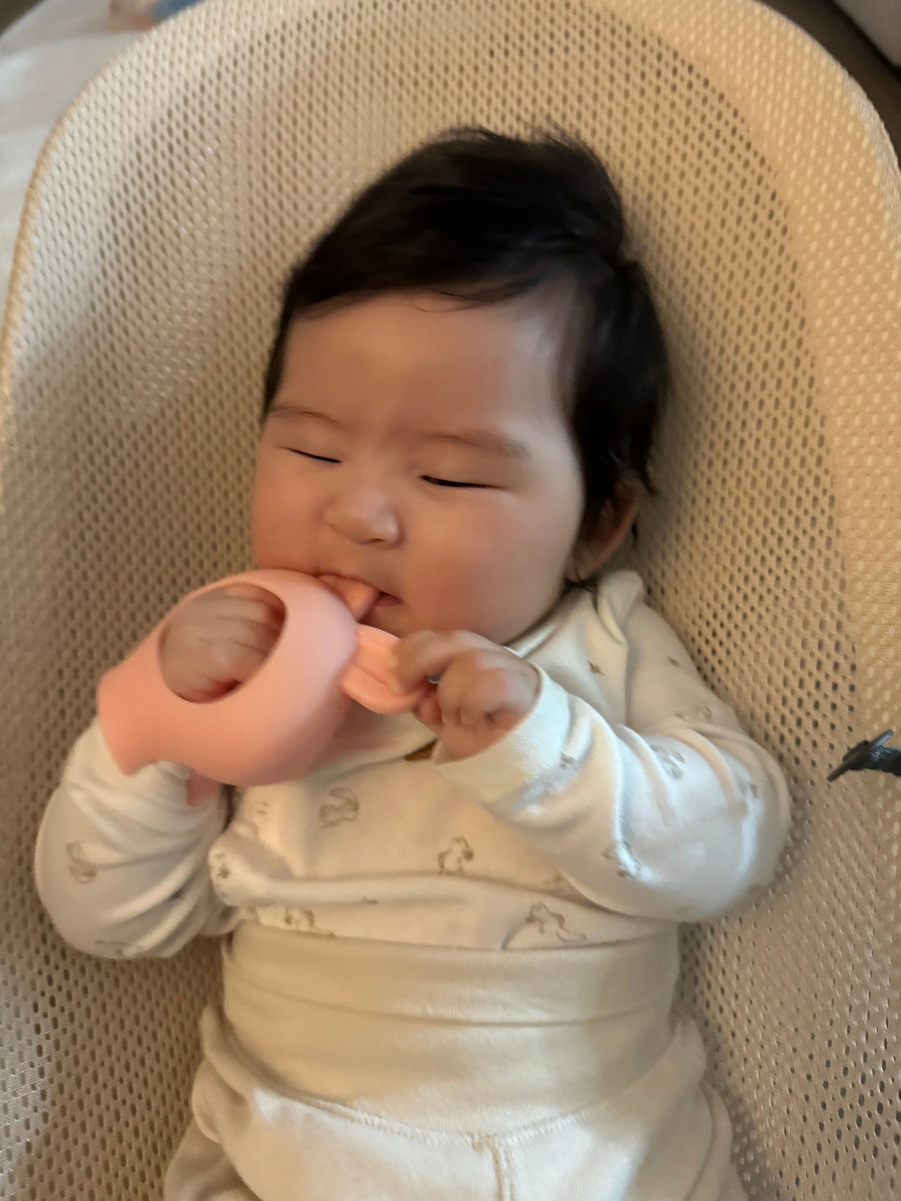 이게 구강 발달에 그렇게 좋은 습관은 아니라서 쪽쪽이나 치발기를 빨도록 유도한다고 하는데 너는 쪽쪽이를 싫어하니 치발기를 계속 팔목에 끼워줘야 하나 고민이 된다. 일단 내일부터는 치발기를 써봐야겠다.