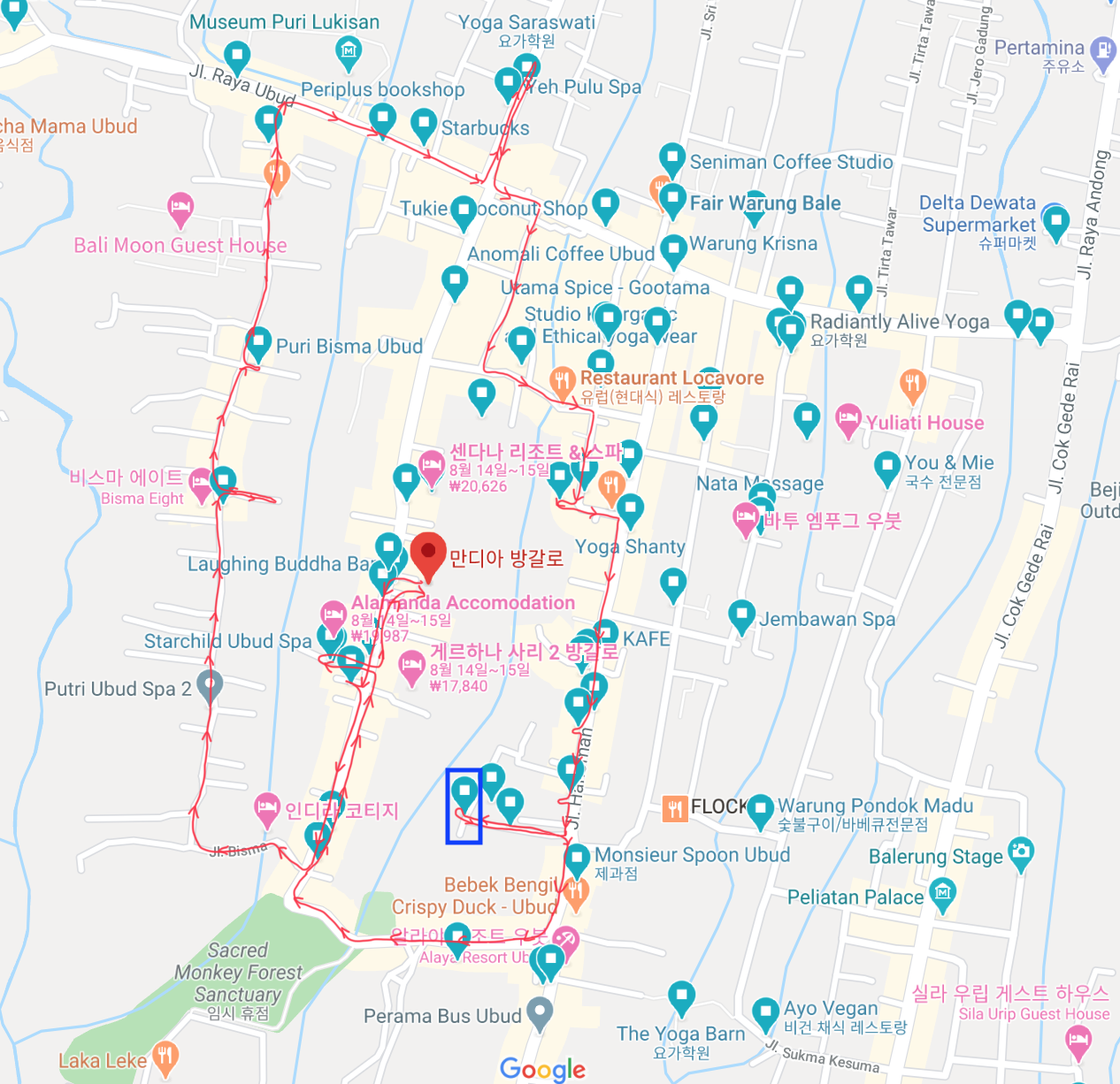 이번처럼 새벽에 도착하는 경우는 이틀 정도 미리 숙소를 예약해두는데, 최대한 번화가에서 완전 가깝고 가성비가 좋은 곳을 선택한다. 그리고 숙소를 찾으러 가기 전에 구글 지도를 켜고, 어떤 경로로 걸어다닐지를 결정한다. 구글 지도에는 미리 찾아 핀(pin)해둔 숙소, 음식점, 요가원, 은행, 마트를 한 눈에 확인할 수 있어서 경로 짜기에 매우 용이하다.