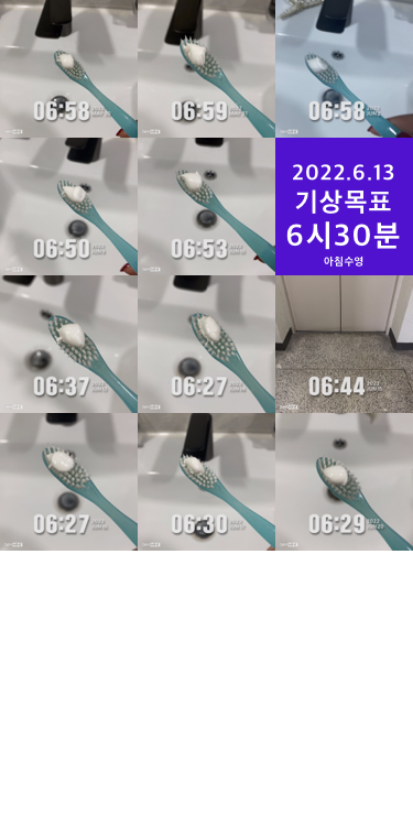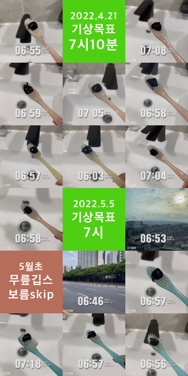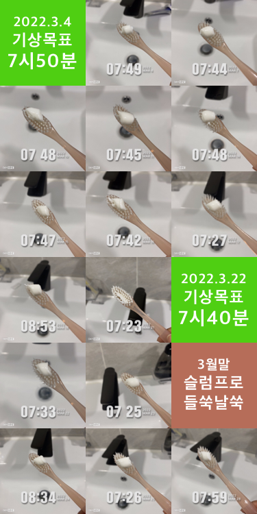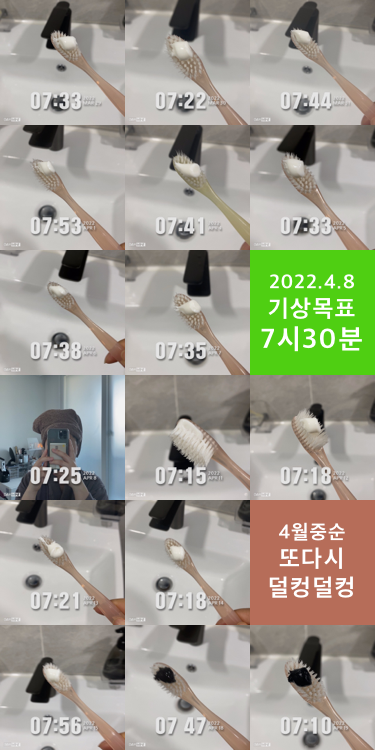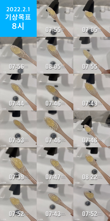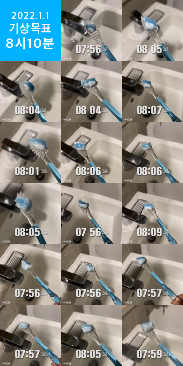 그리고 그동안 기록했던 치약 사진을 한 판으로 정리하면서 다시금 힘이 났다. 중간중간 목표한 시간보다 한참이나 지난 시간에 일어났던 사진이 간혹 섞여 있었지만 바로 뒤에는 또다시 원래의 페이스를 되찾은 사진들이 간혹 눈에 보였고, 큰 흐름에서 봤을 때는 점점 기상시간이 앞당겨지는 모습이 확실히 보였다. 조금씩 삐걱대지만 시간의 조각들을 모아놓고 보니 꽤 괜찮은 결과를 만들어 나가고 있는 나 자신이 대견했다. 작은 성공의 경험이 좀 더 큰 성공의 경험을 만들어주고 있었다.