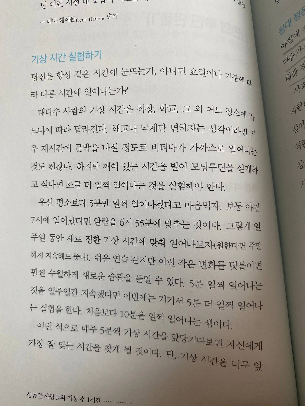 최근에는 코로나로 풀 재택근무를 하게 되면서 그나마 8시에 일어나던 기상시간이 출근 10분 전인 8시 50분으로 바뀌었고, 물리적인 시간을 들여 퇴근하지 않아도 되니 일을 중단하지 못하고 거의 하루 종일 책상 앞에서 일만 하는 지경에 이르렀다. 침대-책상-침대를 반복하는 일상에 나만을 위한 시간 따위는 없었다. 그러던 중 우연히 SNS에서 『성공한 사람들의 기상 후 1시간』 이란 제목의 책을 발견했다. 이 책은 여느 자기계발서와는 조금 달랐다.