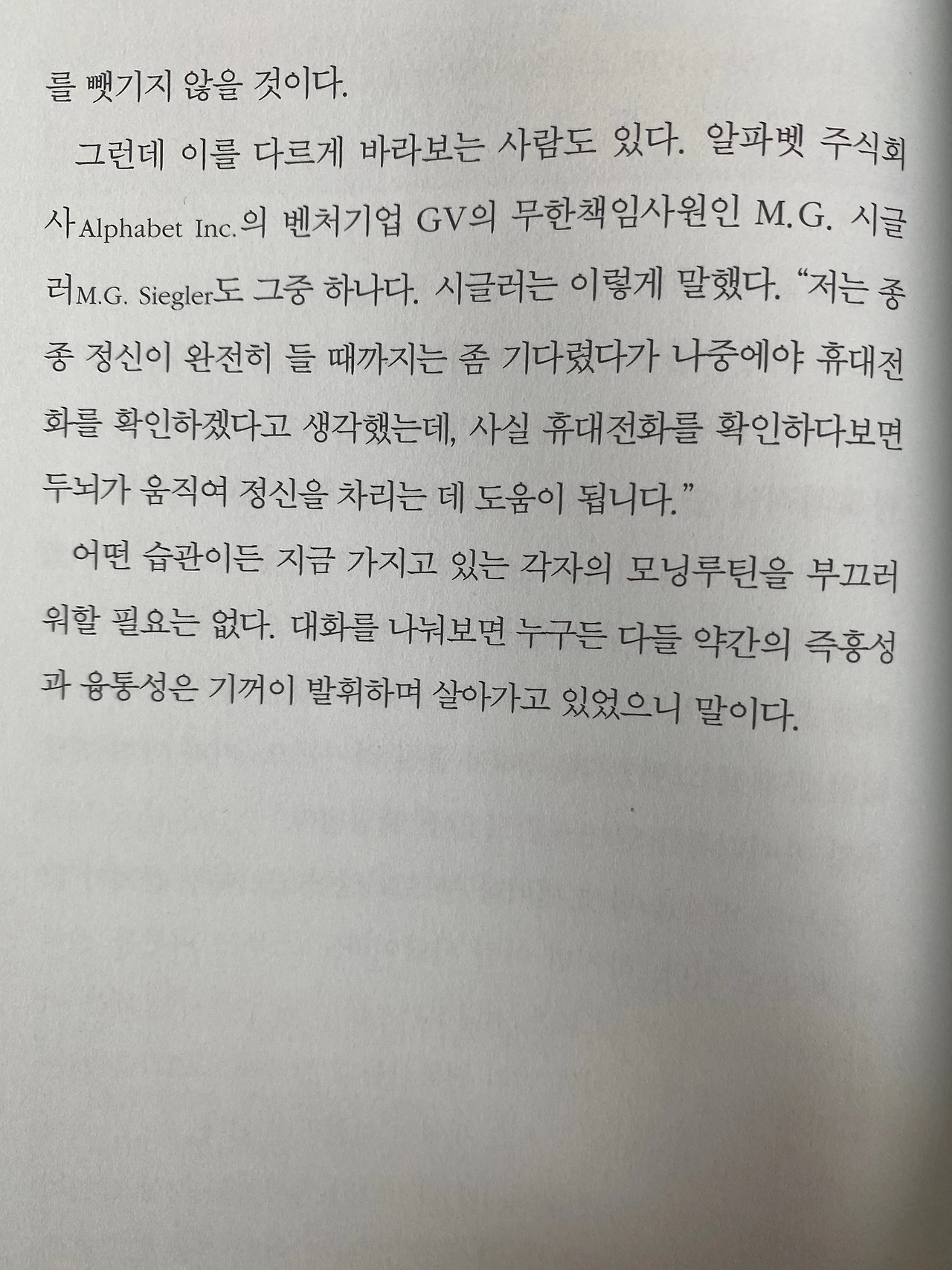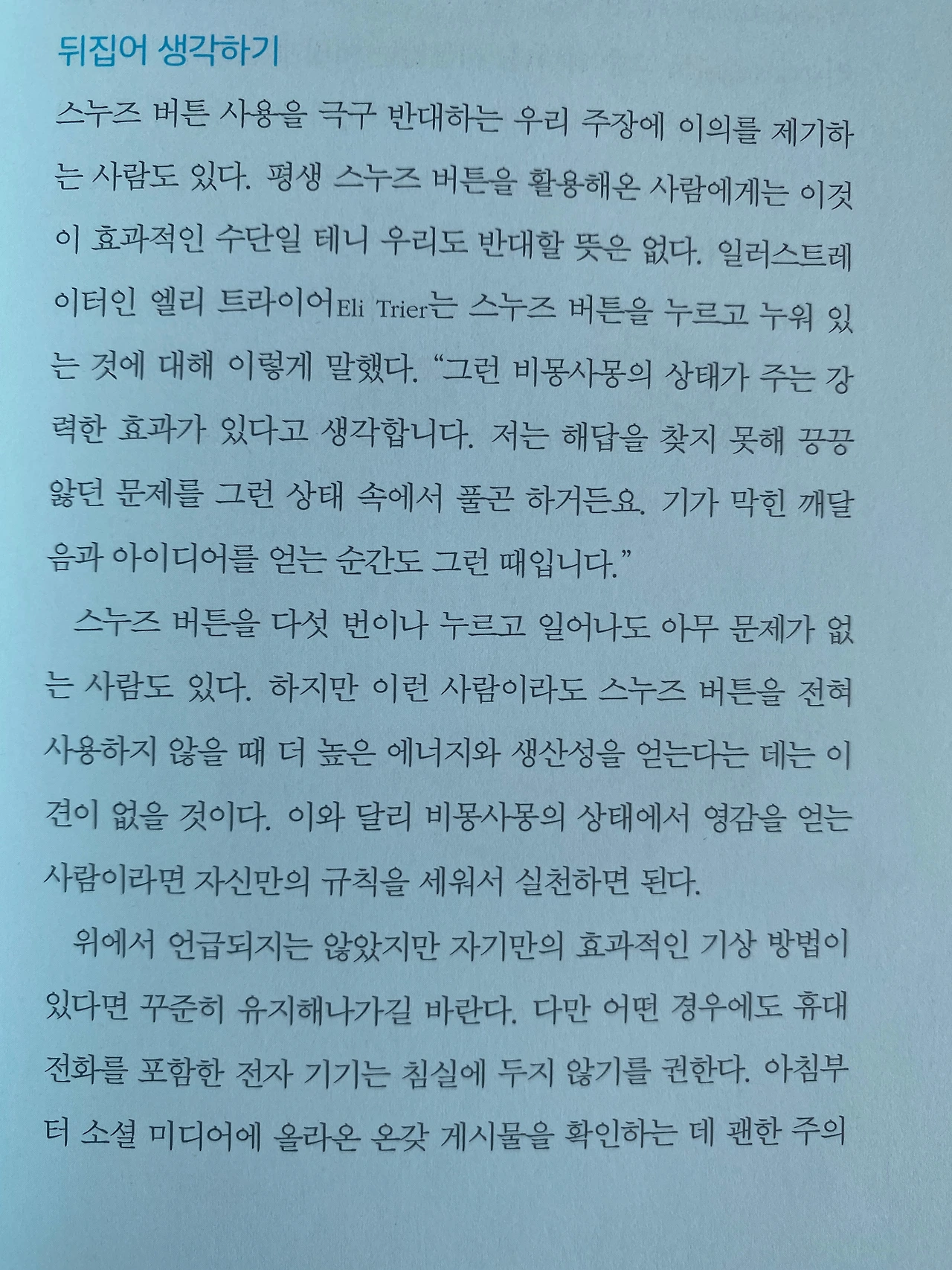 이 책은 무조건 새벽같이 일어나서 내 시간을 가지라고 말하지 않는다. 사람마다 각자의 사정이 있기 때문에 각자에게 맞는 최적의 기상시간은 모두 다르다는 전제를 가지고 있다. 그럼에도 불구하고 아침시간을 활용하면 조금이라도 자신만의 시간을 확보할 수 있으니 조금 일찍 일어나는 것을 실험해 각자 자신만의 최적의 기상 시간을 찾아보라 권한다. "일찍 일어나지 못하는 너는 루저야 일찍 일어나!"가 아니라 "지금처럼도 충분히 괜찮은데, 그래도 너 자신을 위해 한 번 일찍 일어나 보는 게 어때?"로 느껴진달까.