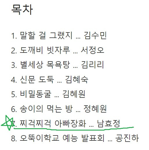 이 책을 온라인 오프라인 서점에서 볼 때마다 제가 쓴 다른 교육서와는 다른 느낌의 무언가가 마음에서 올라옵니다. 혼자 잘 커서 대견하기도 하고 한쪽에 밀어놓은 꿈이 생각나 짠하기도 한 그런 마음이랄까요. 그래도 저는 쟁쟁하게 성장한 아동문학작가학교 7기 작가님들의 작품과 함께 수록되어 있는 저의 동화를 많이 사랑합니다.