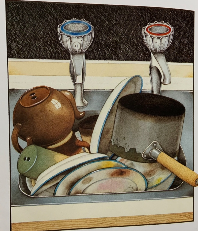 피곳 씨는 설거지를 하고 다림질은 한다. 아이들은 자신의 침대를 정리한다. 요리를 함께 하기도 한다. 신기한 것은 가족들이 집안일을 함께 하자 피곳 부인의 얼굴에 눈, 코, 입이 생기고 표정이 생긴다. 작가만이 할 수 있는 기발한 발상이다.