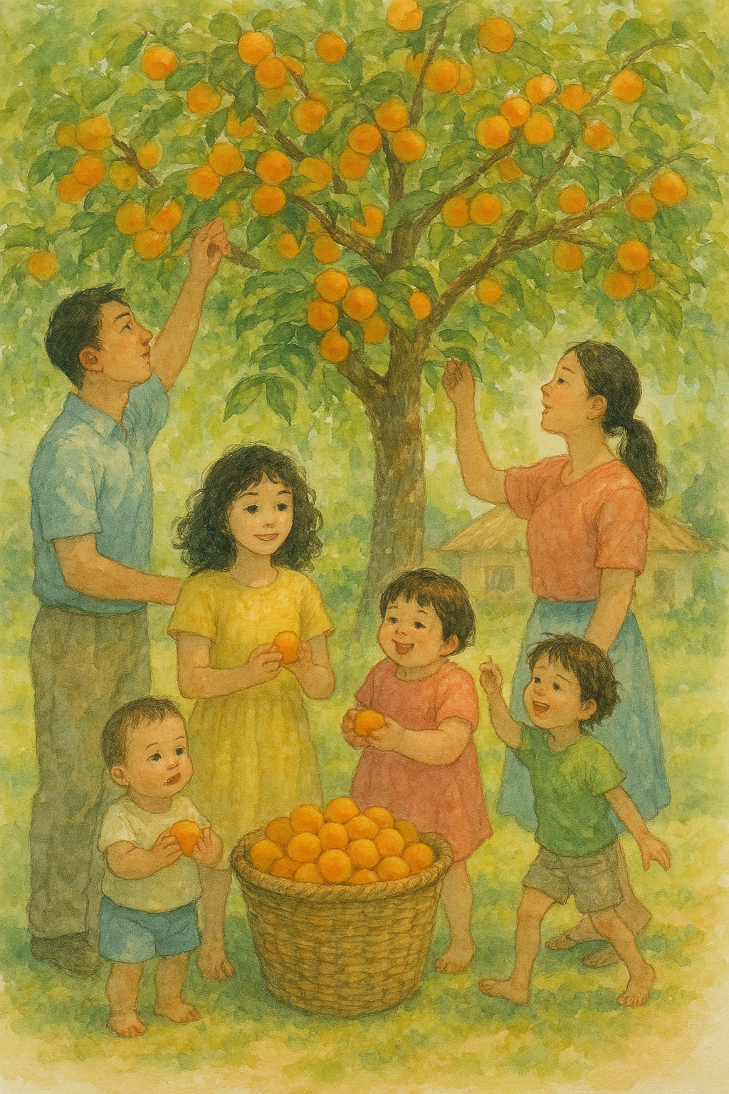 낮은 곳의 살구는 키가 작은 아이들이 따고 높은 곳의 살구는 키가 큰 아빠가 주로 땄다. 살구를 바구니에 모은다. 한 바구니, 두 바구니, 세 바구니째 가득 찬다.