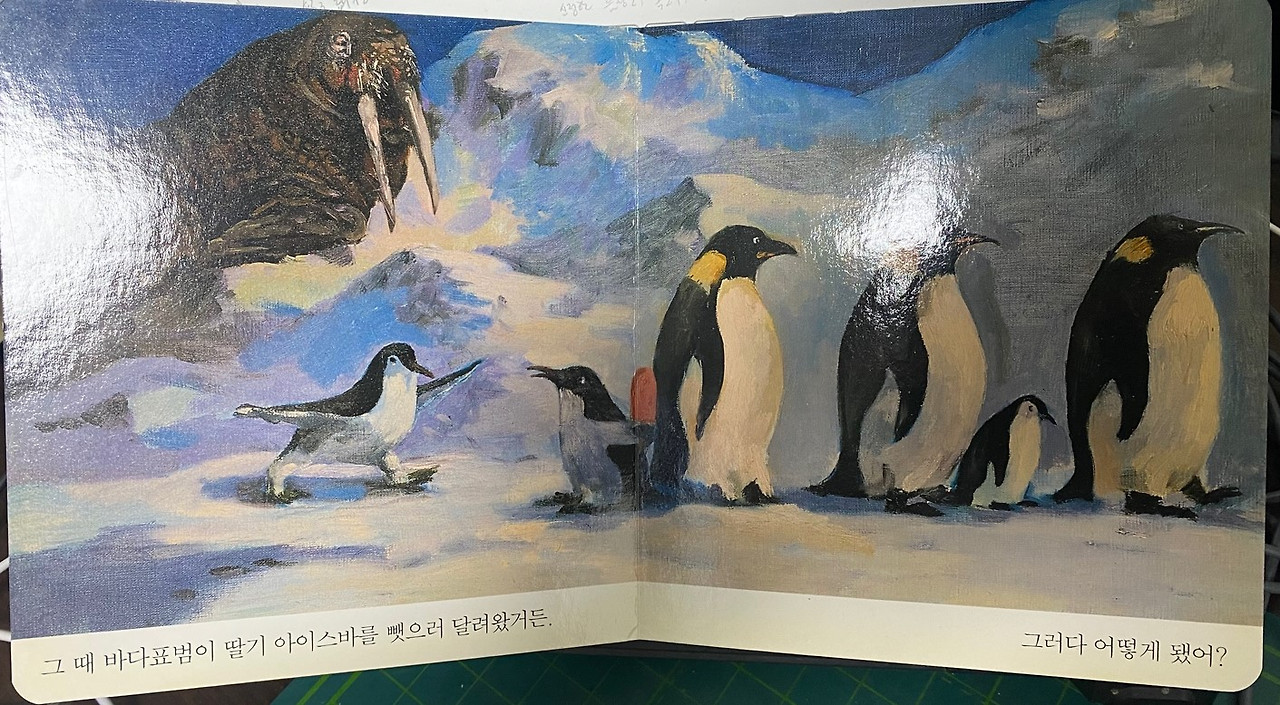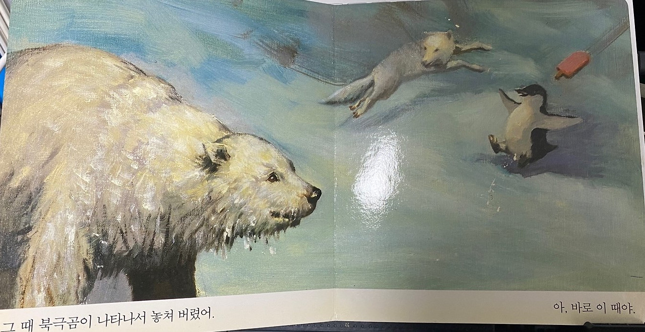 그림책 한 장을 넘겨보면 남극펭귄이 잔뜩 나온다. 펭귄들이 서로 딸기 아이스크림바를 먹겠다고 아우성이다.