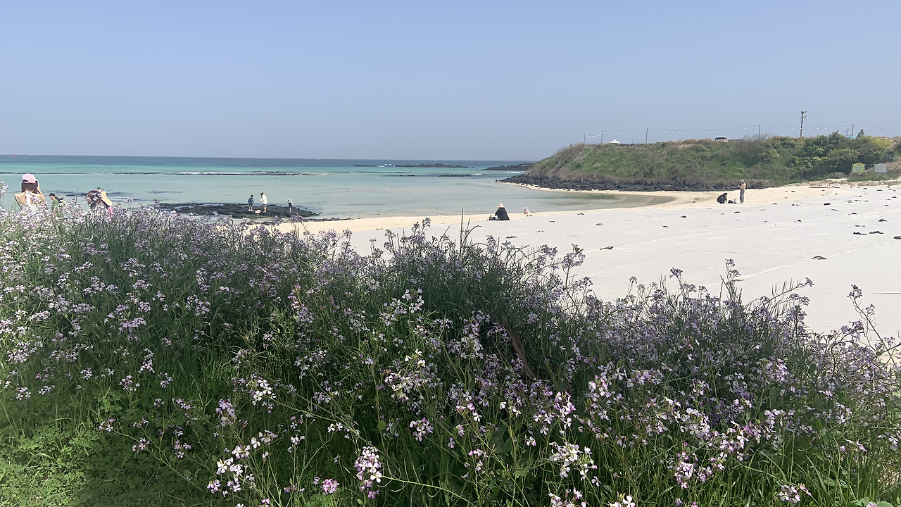 “이게 유채꽃이야? 신기하네. 보라색꽃이랑 바다색깔이랑 하늘이랑 정말 예술이야! “