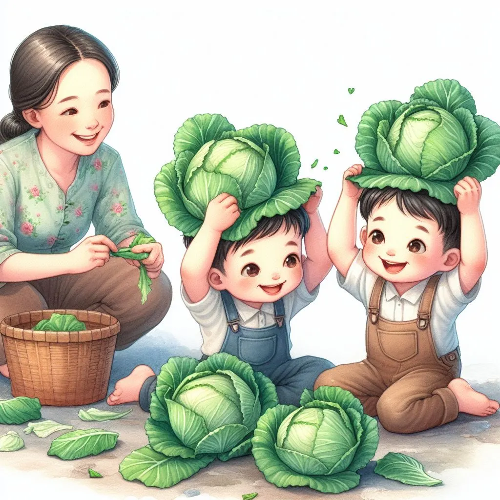 이번엔 데데가 양배추 잎을 하나 떼어 머리에 얹습니다. 가만히 바라보던 결이도 형을 따라 머리에 양배추 잎을 얹습니다. 가볍게 머리에 얹힌 한 장짜리 양배추 모자는 가벼워서 마음 놓고 이곳저곳을 걸어 다닐 수 있고 두 손도 자유롭습니다.
