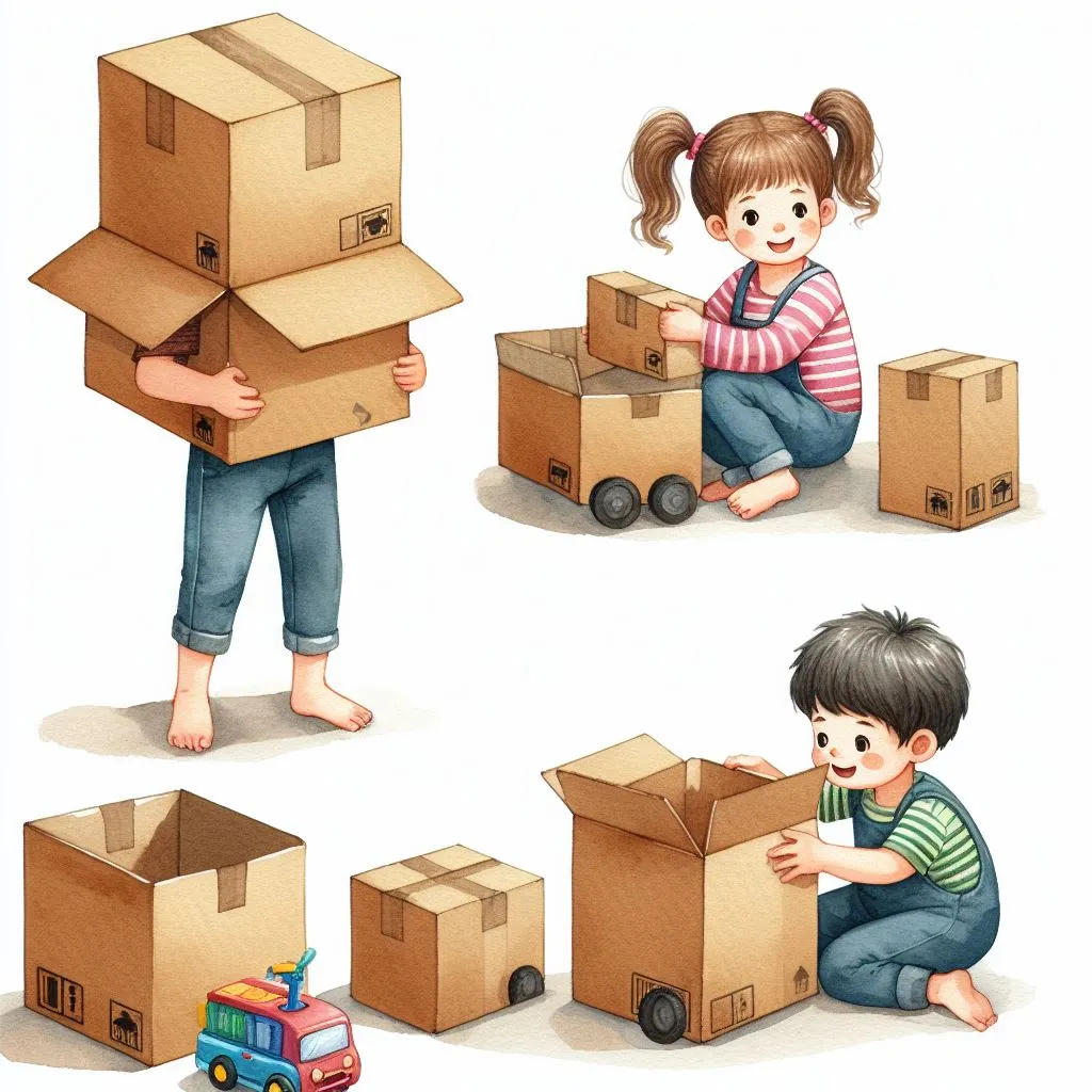 엄마가 흔쾌이 빈 상자를 아이에게 내어주면 이제 흥미진진한 놀이가 시작되지요. 어떤 아이는 상자 안에 들어가 놀이합니다. 또 어떤 아이는 상자를 뒤집어쓰고 거북이 놀이를 하기도 합니다.