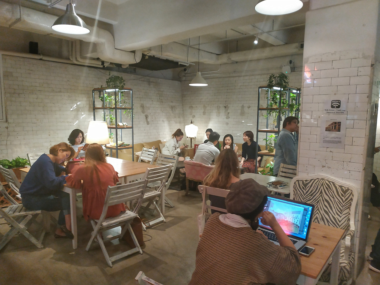 수다를 떠는 사람들, 다 같이 모여 스터디를 하는 사람들, 책을 읽는 사람들, 노트북에 열중하고 있는 모습들..