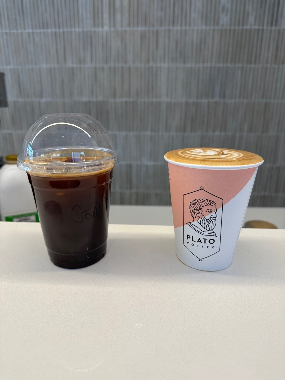 오전에 운동을 마치고 마트 들르는 길에 Plato라는 이름의 cafe에 들렀다. 예전에 다른 지점에 있는 Plato를 갔었는데 은근히 까다로운 미각을 가진 남편은 이곳 커피가 맘에 든다며 이 브랜드를 기억하고 있었다. 그러니 발견하자마자 똥 마려운 강아지처럼 입구로 가까이 갔다가 다시 나왔다가 다시 들어가는 행보를 보였다. 결국 안으로 들어갔고 원하는 커피를 주문했다. 남아공에는 '아아'가 없다. 그러니까 한국의 웬만한 카페에는 당연히 있는 아이스아메리카노가 없다는 거다. 처음에 이 더운 나라에 아이스아메리카노를 안 판다는 사실에 깜짝 놀랐다. 하긴, 빙수도 없는 나라다. 그래서 이곳에 사는 한국 사람들은 아이스아메리카노가 먹고 싶을 때 핫 아메리카노를 시키고 따로 물 조금, 얼음을 주문해서 알아서 제조해서 먹곤 했다. 요즘에는 이름은 다르지만 아이스아메리카노 메뉴가 있는 곳이 점점 늘어나는 추세다. 남편은 맛이 궁금하다며 24 란드(한화로 2천 원이 안 되는 가격) 아이스아메리카노와 27 란드 플라토커피를 주문했다.