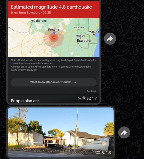 아프리카는 지질학상으로 지진이 안나는 지역으로 알고 있다. 이 부분에 나는 문외한이라 정보를 좀 찾아보려고 했는데 적절한 정보를 찾을 수 없었다. 그러나 주변 사람들은 아프리카는 지진으로부터 안전한 나라라고 이야기한다. 오래전에 지진이 한 번 났었는지, 별이가 학교 선생님이 몇 년 전에 지진 났던 이야기를 들려줬단다. 이번 지진 때문에 인터넷을 좀 찾아보니 2005년에 5.3 규모의 지진으로 약 60명이 사망했던 기사(KBS뉴스)가 있었다. 또한 올해 몇 주전 2023년 5월 22일에 포트엘리자베스 남동쪽 바다에서도 6.8 강도의 지진이 발생했었다는 뉴스(연합뉴스)가 있었다.