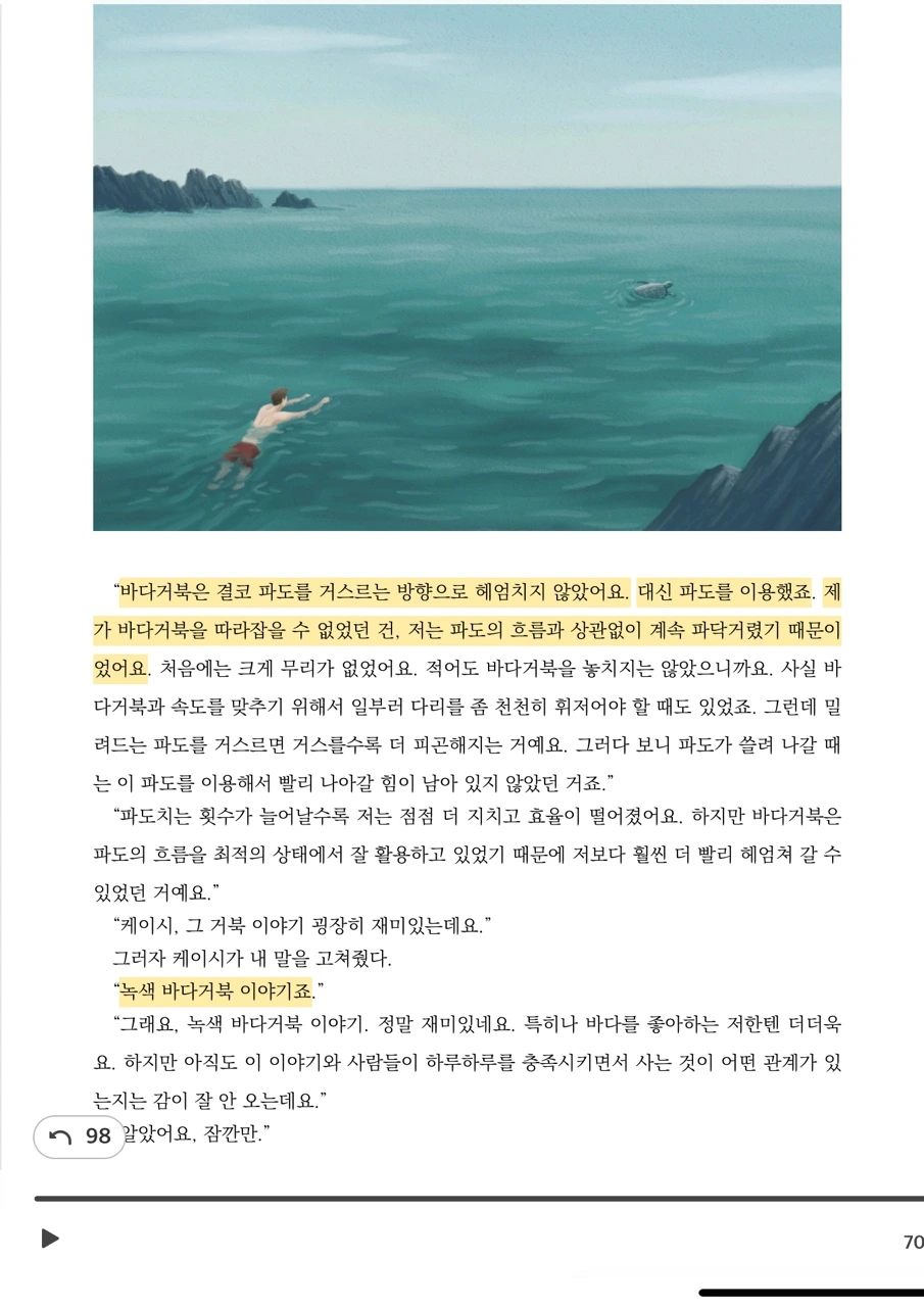 <세상 끝의 카페> 책을 읽다 예화와 함께 문장을 만났습니다. 한 사람이 수면 아래에 있는 녹색 바다거북은 발은 흔들기도 하고, 그냥 물 위에 떠 있기도 하면서 아주 천천히 움직이는 것처럼 보였답니다. 막상 녹색 바다거북을 따라가려고 하니까 따라잡을 수 없었던 거죠. 느리디 느린 거북은 아무리 헤엄쳐도 못 따라잡은 겁니다. 그 이유는 바다거북은 흐름에 맞춰 움직였기 때문입니다. 자기가 나아가려는 방향으로 갈 때 파도의 힘을 적극 활용하고 있었다는 겁니다.